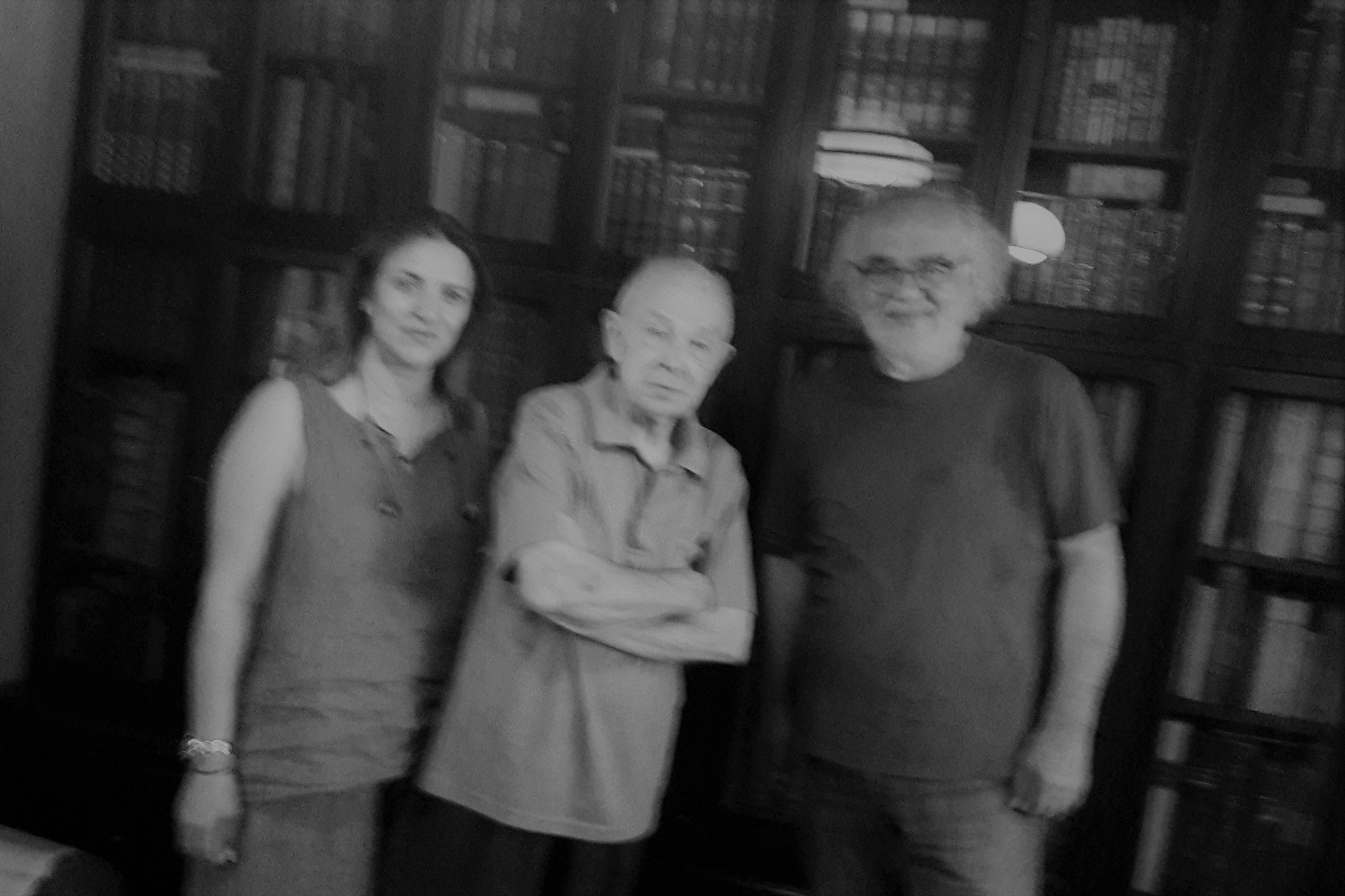 Αθήνα, 22 Ιουνίου 2021. Ο Γιώργος Λαγανάς με την Έλενα Διομήδη-Παρπούνα και μένα μπροστά σε ένα τμήμα της βιβλιοθήκης του, τις μέρες του πακεταρίσματος των βιβλίων του για την Κύπρο.