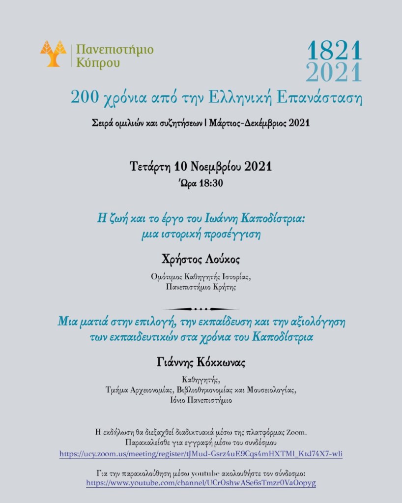 Στην ζωή και το έργο του Ιωάννη Καποδίστρια, αλλά και στην επιλογή, εκπαίδευση και αξιολόγηση των εκπαιδευτικών στην Ελλάδα της εποχής του είναι αφιερωμένη η δέκατη έβδομη εκδήλωση του Πανεπιστημίου Κύπρου, η οποία θα πραγματοποιηθεί την Τετάρτη 10 Νοεμβρίου 2021 στις 18:30, στο πλαίσιο της σειράς ομιλιών και συζητήσεων με τίτλο «1821-2021: 200 χρόνια από την Ελληνική Επανάσταση».