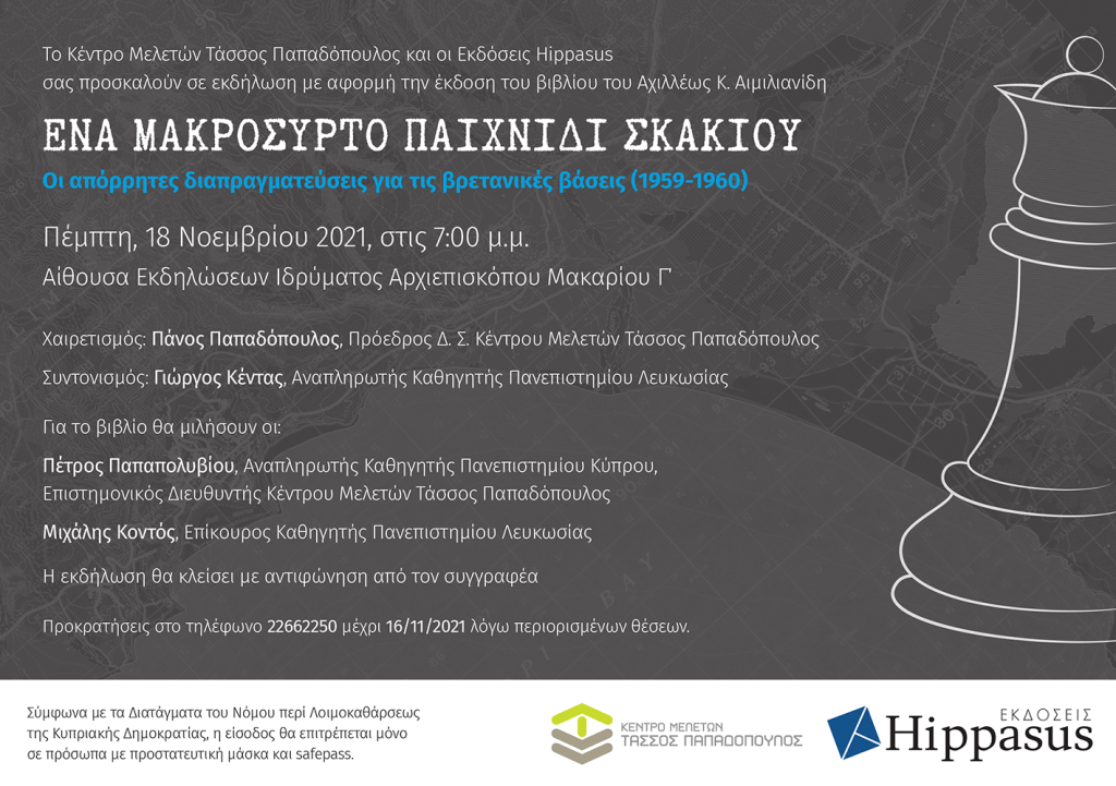 Ένα ενδιαφέρον βιβλίο θα παρουσιαστεί την Πέμπτη 18 Νοεμβρίου 2021 στη Λευκωσία, στην Αίθουσα του Πολιτιστικού Ιδρύματος Αρχιεπισκόπου Μακαρίου Γ΄, στην Αρχιεπισκοπή. Πρόκειται για την έκδοση του Αχιλλέως Κ. Αιμιλιανίδη, “Ένα μακρόσυρτο παιχνίδι σκακιού. Οι απόρρητες διαπραγματεύσεις για τις βρετανικές βάσεις (1959-1960)”.