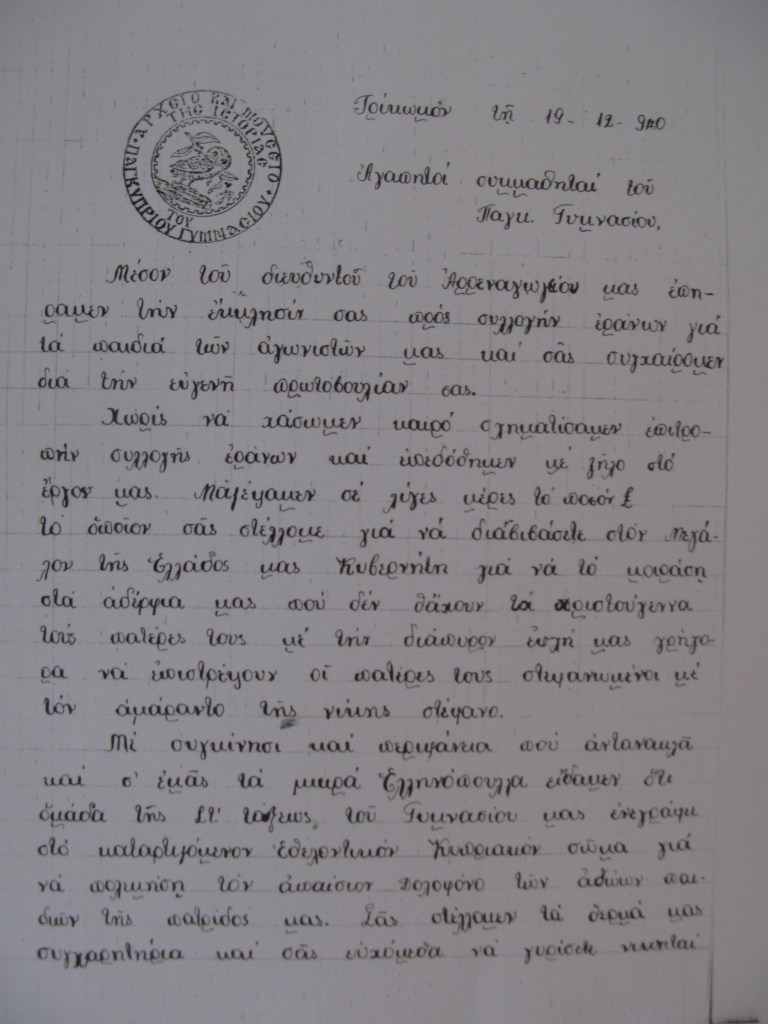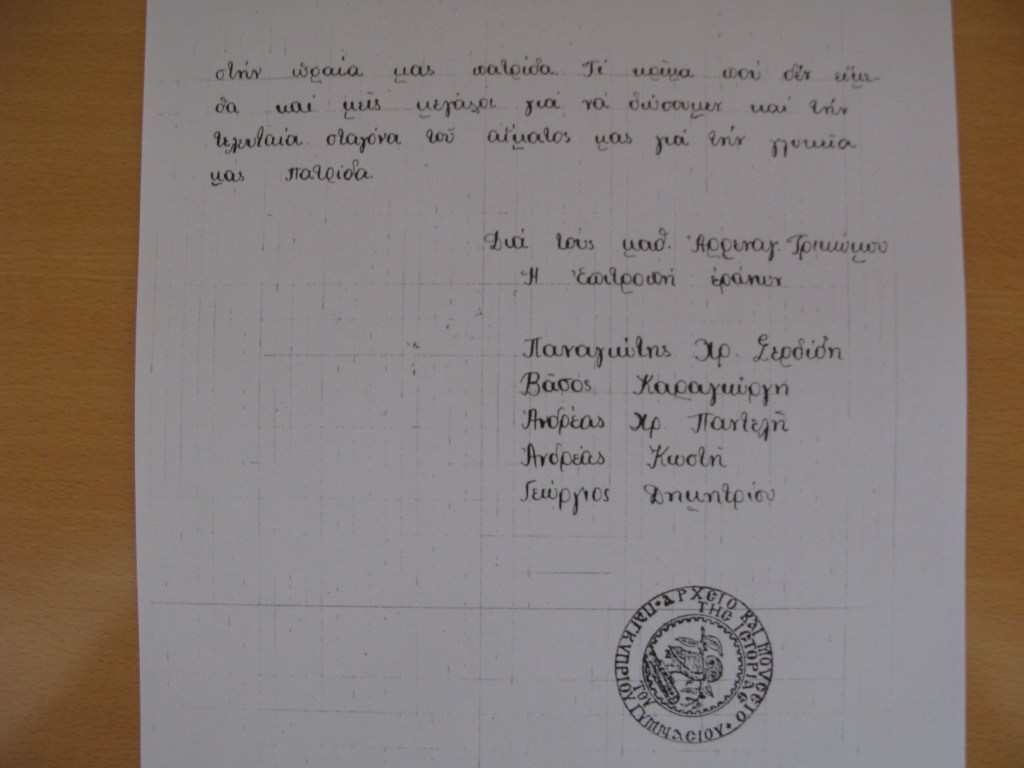 Με συγκίνησι και περιφάνεια που αντανακλά και σ’ εμάς τα μικρά Ελληνόπουλα είδαμεν ότι ομάδα της Στ΄ τάξεως του Γυμνασίου μας ενεγράφη στο καταρτιζόμενον Εθελοντικόν Κυπριακόν σώμα για να πολεμήση τον απαίσιον δολοφόνο των αθώων παιδιών της πατρίδος μας. Σας στέλλομεν τα θερμά μας συγχαρητήρια και σας ευχόμεθα να γυρίσετε νικηταί στην ωραία μας πατρίδα. Τι κρίμα που δεν είμεθα και μεις μεγάλοι για να δώσουμεν και την τελευταία σταγόνα του αίματός μας για την γλυκεία μας πατρίδα.