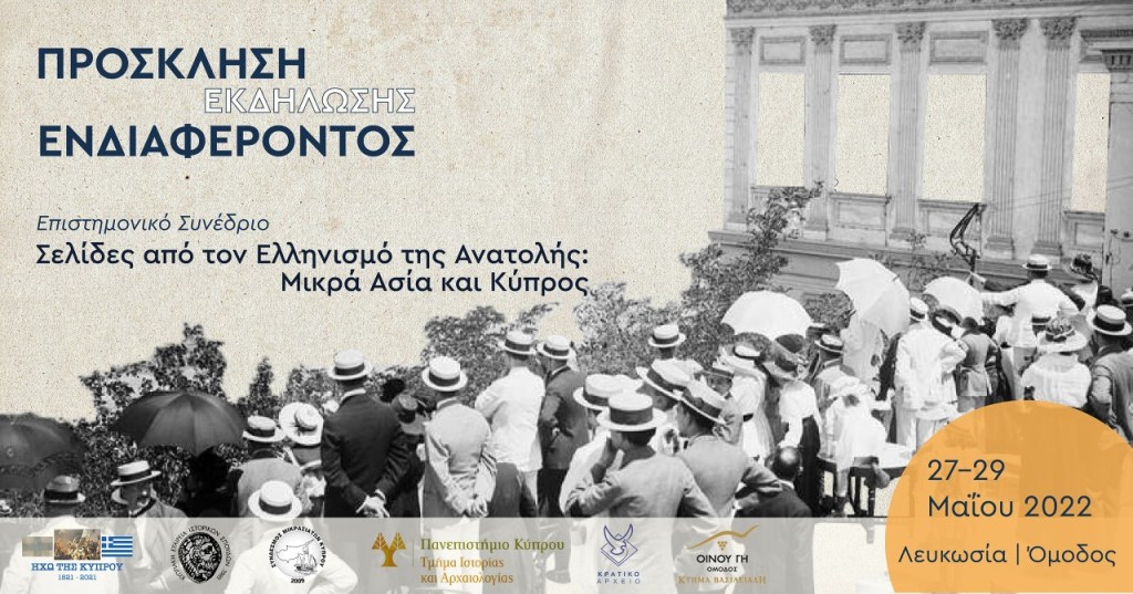 Το Τμήμα Ιστορίας και Αρχαιολογίας του Πανεπιστημίου Κύπρου, η Ηχώ της Κύπρου 1821-2021, η Κυπριακή Εταιρεία Ιστορικών Σπουδών, ο Σύνδεσμος Μικρασιατών Κύπρου και το Κρατικό Αρχείο σάς προσκαλούν σε εκδήλωση ενδιαφέροντος και υποβολή πρότασης (και περίληψης) ανακοίνωσης για το Επιστημονικό Συνέδριο «Σελίδες από τον Ελληνισμό της Ανατολής: Μικρά Ασία και Κύπρος» που πραγματοποιείται με αφορμή την επέτειο των 100 χρόνων από τη Μικρασιατική Καταστροφή, το οποίο θα διεξαχθεί στις 27, 28 και 29 Μαΐου 2022, στη Λευκωσία (Παρασκευή, 27 Μαΐου) και στο οινοποιείο Οίνου Γη-Κτήμα Βασιλειάδη στο Όμοδος (Σάββατο 28 και Κυριακή 29 Μαΐου).