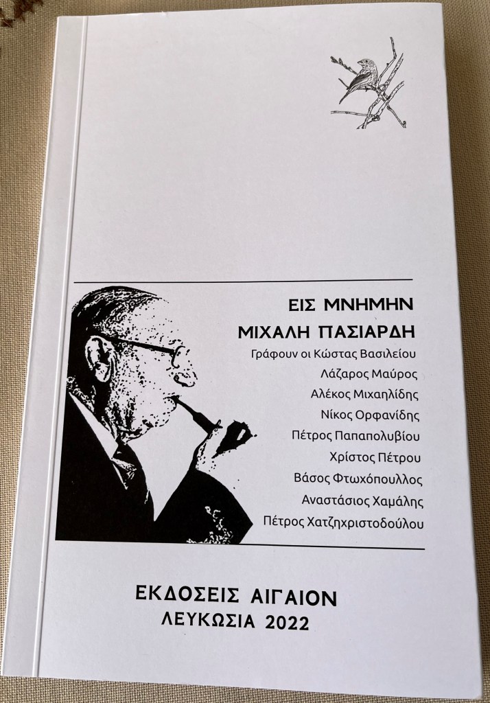 Συμπληρώνεται αύριο, Πρωτομαγιά, ένας χρόνος από τον θάνατο του ποιητή Μιχάλη Πασιαρδή (1941-2021). Για τον Πασιαρδή κυκλοφόρησε πρόσφατα από τις εκδόσεις “Αιγαίον” το βιβλιαράκι “Εις μνήμην Μιχάλη Πασιαρδή”. Γράφουν οι Κώστας Βασιλείου (το ποίημα “Σάββατο”), Λάζαρος Μαύρος (“Τα χελιδόνια στου Πασιαρδή την κηδεία”), Αλέκος Μιχαηλίδης (“Εις μνήμην: Μέσα στο λλίον το πολλύν”), Νίκος Ορφανίδης (“Ο φίλος μου ποιητής Μιχάλης Πασιαρδής που έφυγε”), Πέτρος Παπαπολυβίου (“Για τον Μιχάλη Πασιαρδή [1941-2021]), Χρίστος Πέτρου (“Στο δείλι της Κύπρου του Ομήρου”), Βάσος Φτωχόπουλλος (“Για τον Μιχάλη Πασιαρδή”), Αναστάσιος Χαμάλης (το ποίημα “Μιχάλης Πασιαρδής” ) και Πέτρος Χατζηχριστοδούλου ( “Πόσα ήρτεν ο Πανιώνιος, κουμπάρε μου;”). Στην έκδοση περιλαμβάνεται ένα σκίτσο για τον θάνατο του Πασιαρδή, του Πέτρου Παπαπέτρου (ΠΙΝ), που δημοσιεύθηκε στον “Φιλελεύθερο” στις 2 Μάη του 2021, δυο φωτογραφίες του Λάζαρου Μαύρου, η μία με τον λαμπερό Μιχάλη Πασιαρδή μπροστά στο φουρνάκι του “Αιγαίου” και η δεύτερη από την εκκλησία των Αγίων Ανδρονίκου και Αθανασίας, στο Τσέρι, την μέρα της εξόδιας ακολουθίας (4-5-2021). Δημοσιεύεται και ένα τετράστιχο του εκλιπόντος ποιητή.