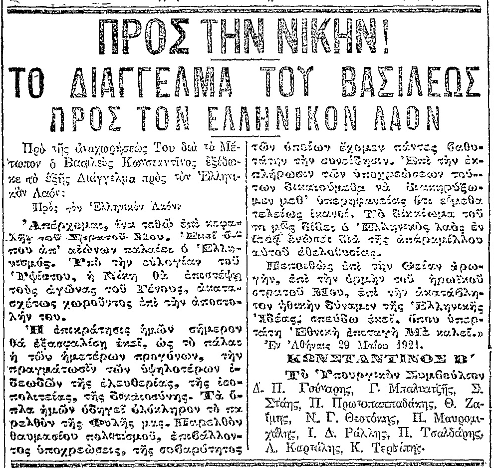 Παραθέτω πρώτα το διάγγελμα του Κωνσταντίνου (από την εφημ. Εμπρός, της 30ης Μαΐου 1921) με τις υπογραφές σύμπαντος του Υπουργικού Συμβουλίου. Τέσσερεις από τους υπογράφοντες εκετελέστηκαν ύστερα από τη “Δίκη των έξι”, τον Νοέμβριο του 1922: Γούναρης, Θεοτόκης, Μπαλτατζής, Πρωτοπαπαδάκης.