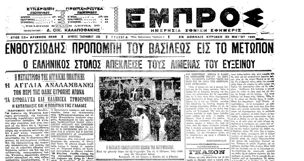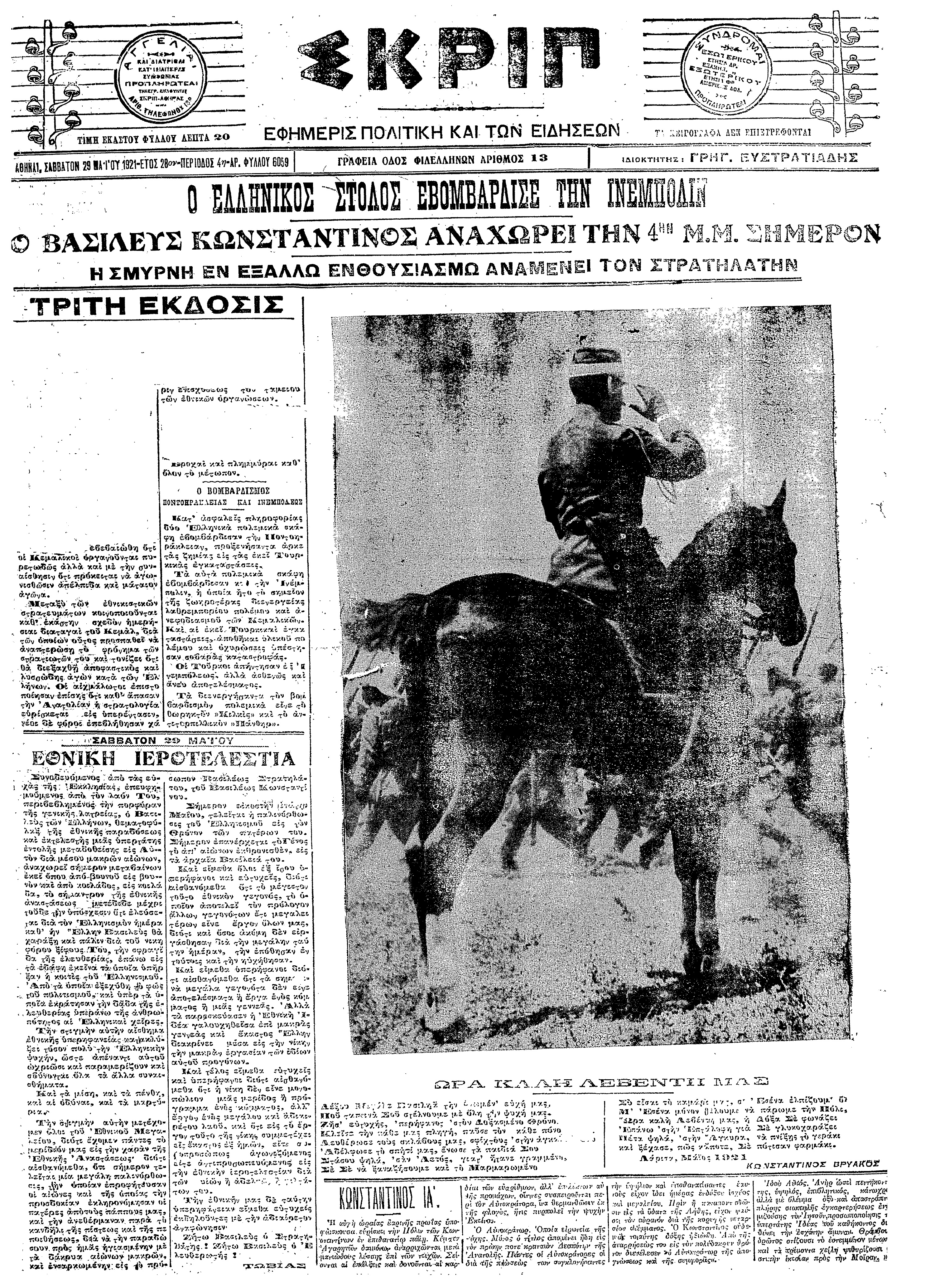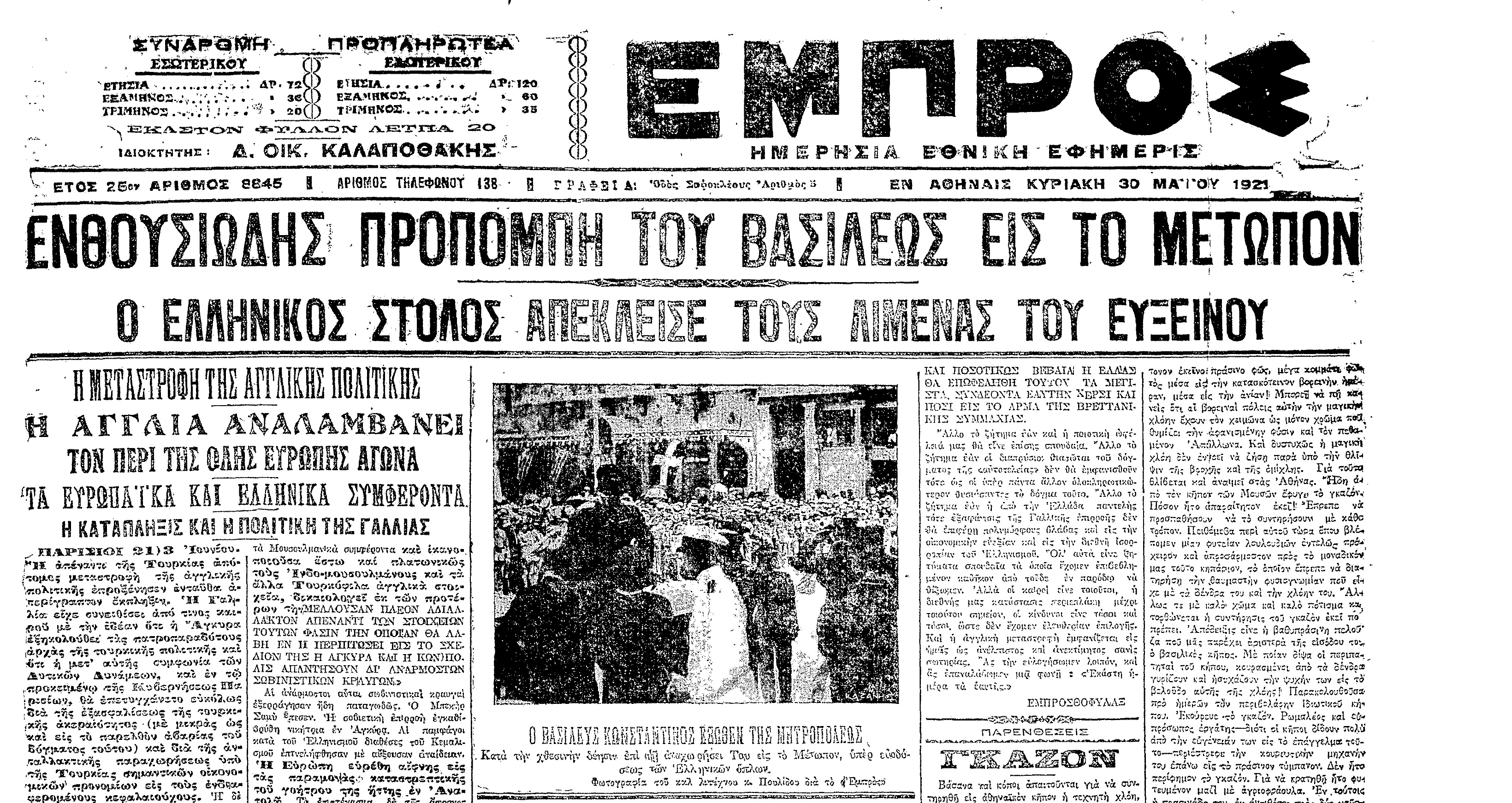 29 Μαΐου σήμερα και θυμηθήκαμε το ταξίδι του τότε βασιλιά Κωνσταντίνου, ως νεκραναστηθέντος Κωνσταντίνου Παλαιολόγου, προς τη Σμύρνη, εν έτει 1921, τέτοια μέρα. Κάποιος ευφάνταστος αυλικός σκέφτηκε να “πραγματώσει” ακόμη μια λαϊκή προφητεία στο πρόσωπο του “Κωνσταντίνου του ΙΒ¨”, όπως ονόμαζαν οι βασιλόφρονες και οι αυλοκόλακες τον γιο του Γεωργίου του Α, της Ελλάδας, από την άνοιξη του 1913, όταν ανέβηκε στον θρόνο.