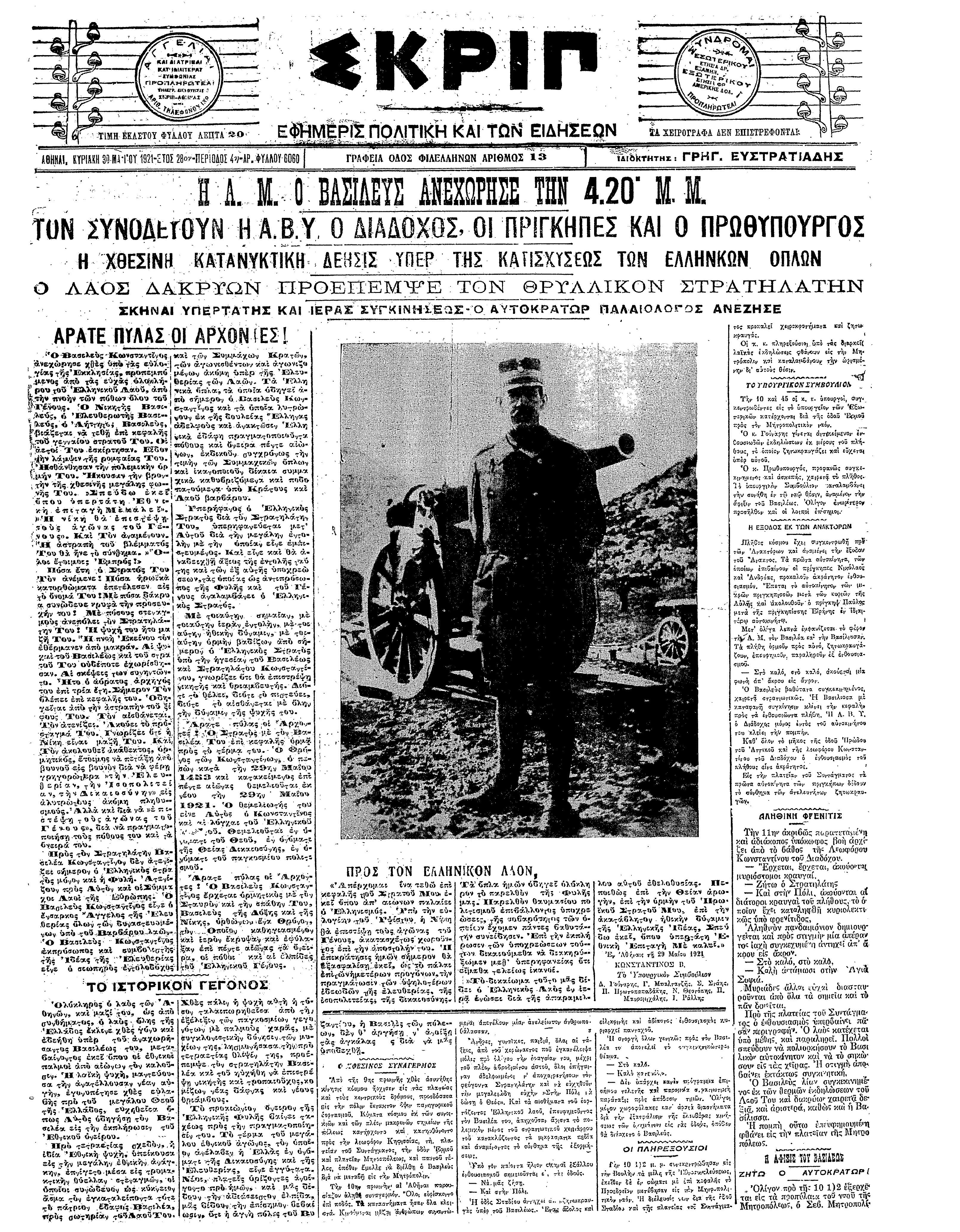 Και πρωτοσέλιδα της εποχής, από τις αθηναϊκές φιλοβασιλικές εφημερίδες, το Σκριπ και το Εμπρός. Αξίζει να τα διαβάσετε καθώς αποτυπώνουν το κλίμα της εποχής.