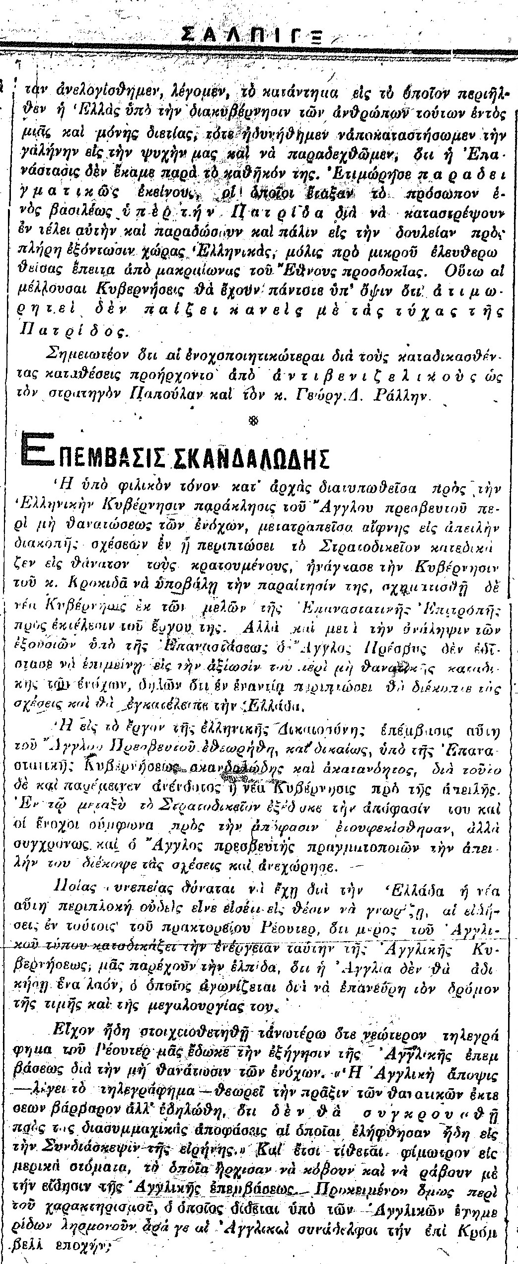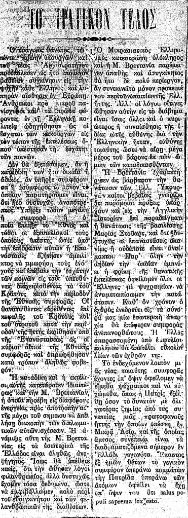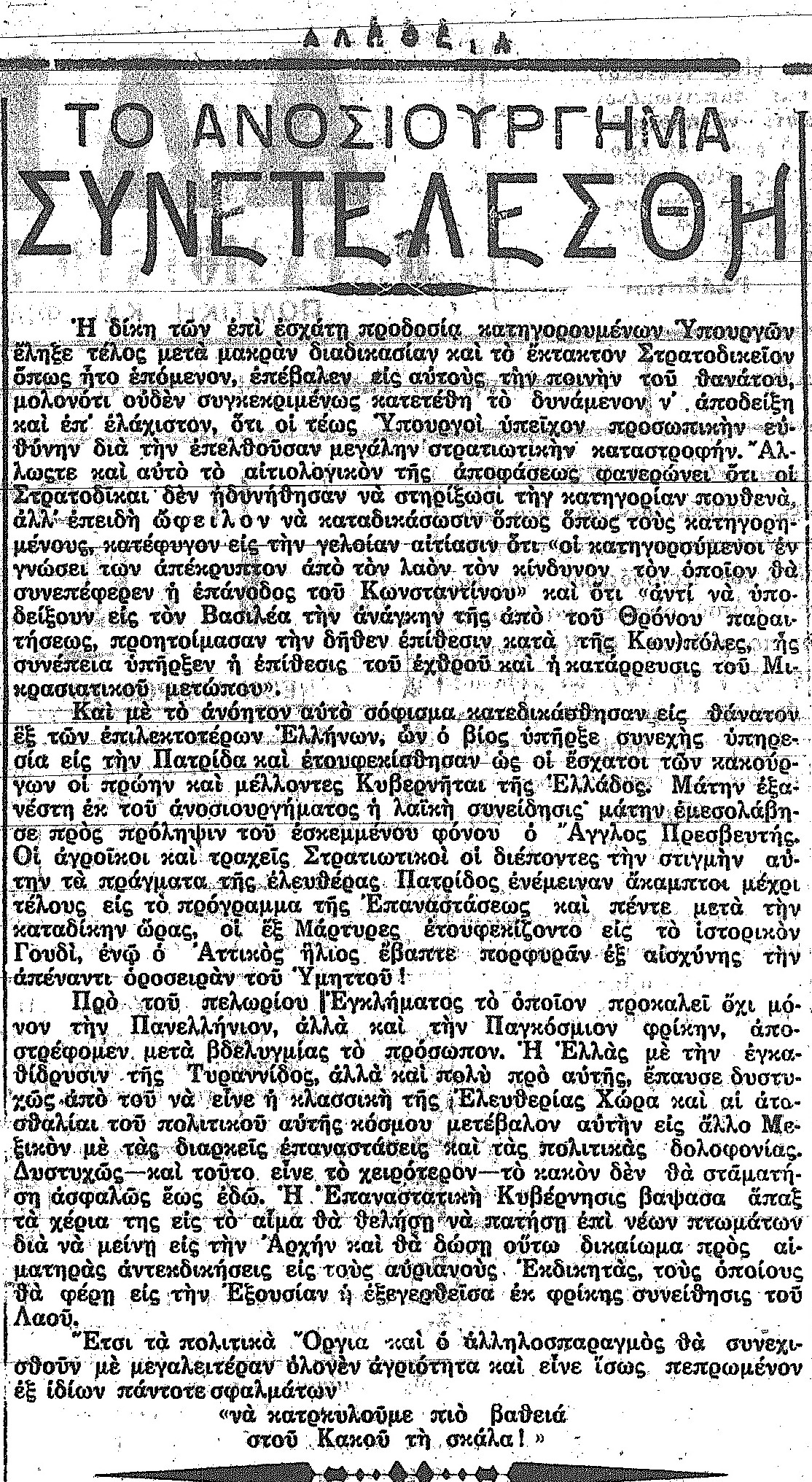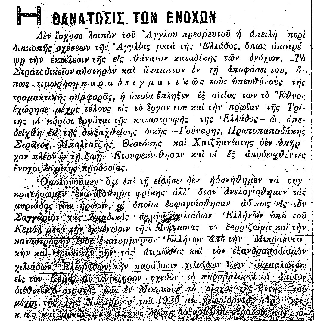 Δύο σχόλια της “Σάλπιγγος” υπέρ της εκτέλεσης. στο φύλλο 18 Νοεμβρίου / 1 Δεκεμβρίου 1922