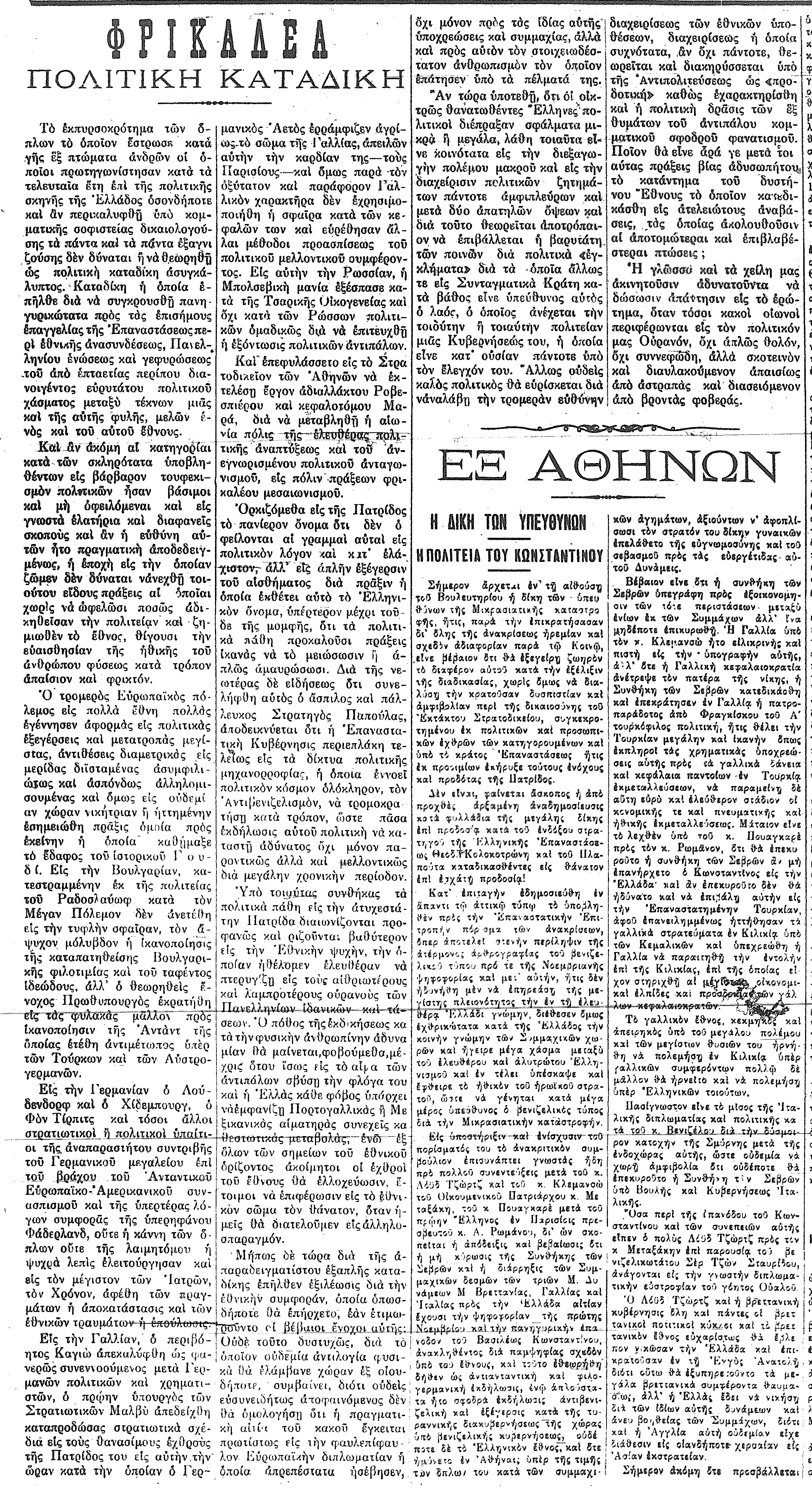 Τέλος, στο πρωτοσέλιδο άρθρο του “Κυπριακού Φύλακος” επαναλαμβάνονται τα αισθήματα φρίκης. Η δίκη και η απόφαση χαρακτηρίζονται πολιτικές και η λευκωσιάτικη εφημερίδα του εξόριστου πλέον Νικόλαου Καταλάνου, αντιβενιζελικού μεν αλλά διατηρήσαντος ήπιους τόνους στον Εθνικό διχασμό, γράφει ότι οι οιωνοί για το πολιτικό μέλλον της Ελλάδας είναι σκοτεινοί.
