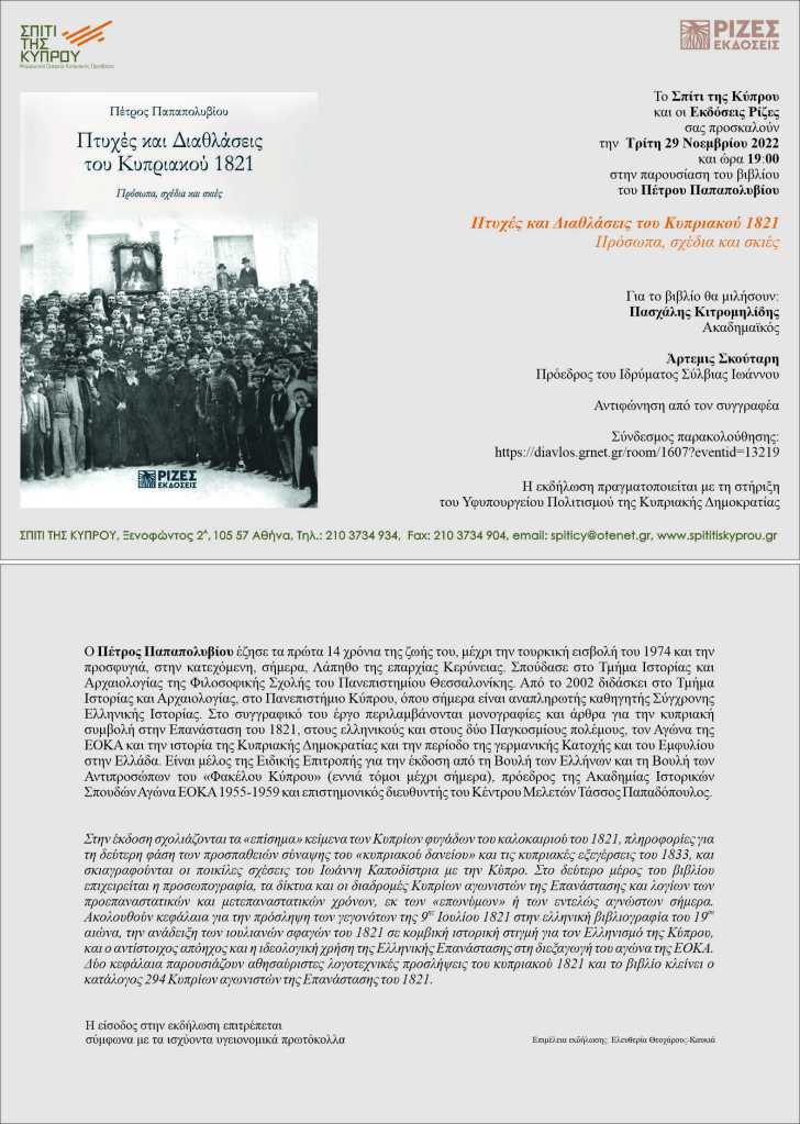 Την Τρίτη 29 Νοεμβρίου 2022, στις 19.00, στο “Σπίτι της Κύπρου” (Ξενοφώντος 2Α, Σύνταγμα, στο κτίριο της Κυπριακής Πρεσβείας) στην Αθήνα, θα παρουσιαστεί το βιβλίο μου με τίτλο “Πτυχές και διαθλάσεις του κυπριακού 1821: Πρόσωπα, σχέδια και σκιές“.