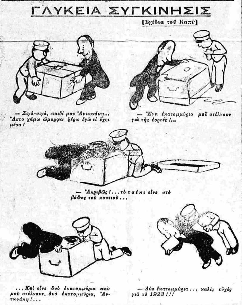 Το πρωτοχρονιάτικο φύλλο του 1923 της «Πατρίδος», ως εορταστικό, διανθίζεται από πολλά σκίτσα. Στην πρώτη σελίδα, εκτός από το κεντρικό πολιτικό σκίτσο ένα δεύτερο, στην κάτω δεξιά γωνία, ξαφνιάζει τον σημερινό αναγνώστη με τη νεωτερικότητά του για την επικρατούσα σοβαροφάνεια. Πρόκειται μάλλον για αντιγραφή από ευρωπαϊκό έντυπο (το υπογράφει ο Άμπελ Φεβρ) και παρουσιάζει ένα σύντομο χαριτωμένο διάλογο, την πρώτη μέρα του χρόνου, ενός απατημένου συζύγου με τη νεοτέρα συμβία του.