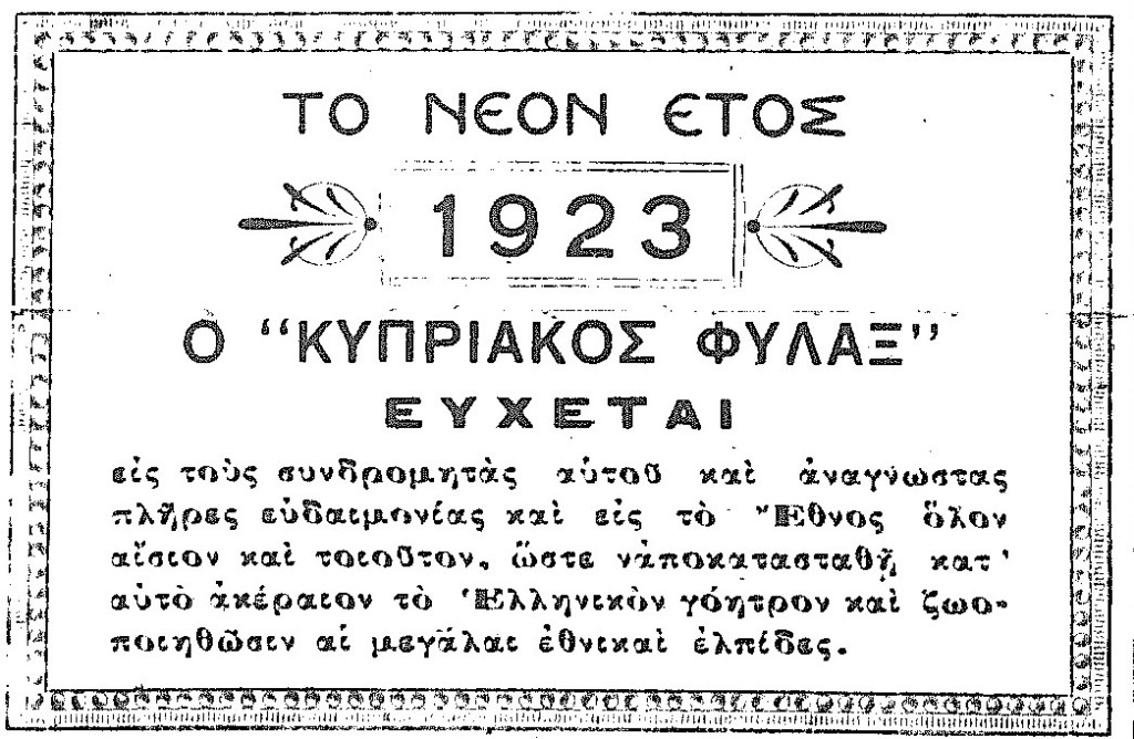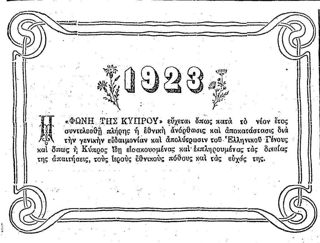 Επιστρέφοντας στο σύνηθες σοβαρόν ύφος των εφημερίδων του 1923, θα δούμε τις πρωτοχρονιάτικες ευχές δύο εφημερίδων της Λευκωσίας. Πρώτα της παλαιότερης, της «Φωνής της Κύπρου», στο φύλλο της 31 Δεκεμβρίου / 13 Ιανουαρίου 1923. Οι «εθνικοί πόθοι» καταγράφονται αναλλοίωτοι, τέσσερις μόλις μήνες μετά τις φλόγες της Σμύρνης, όμως στη σκιά της Καταστροφής οι λέξεις ανόρθωσις και αποκατάστασις έχουν πλέον διαφορετική σημασία και διπλή ανάγνωση.