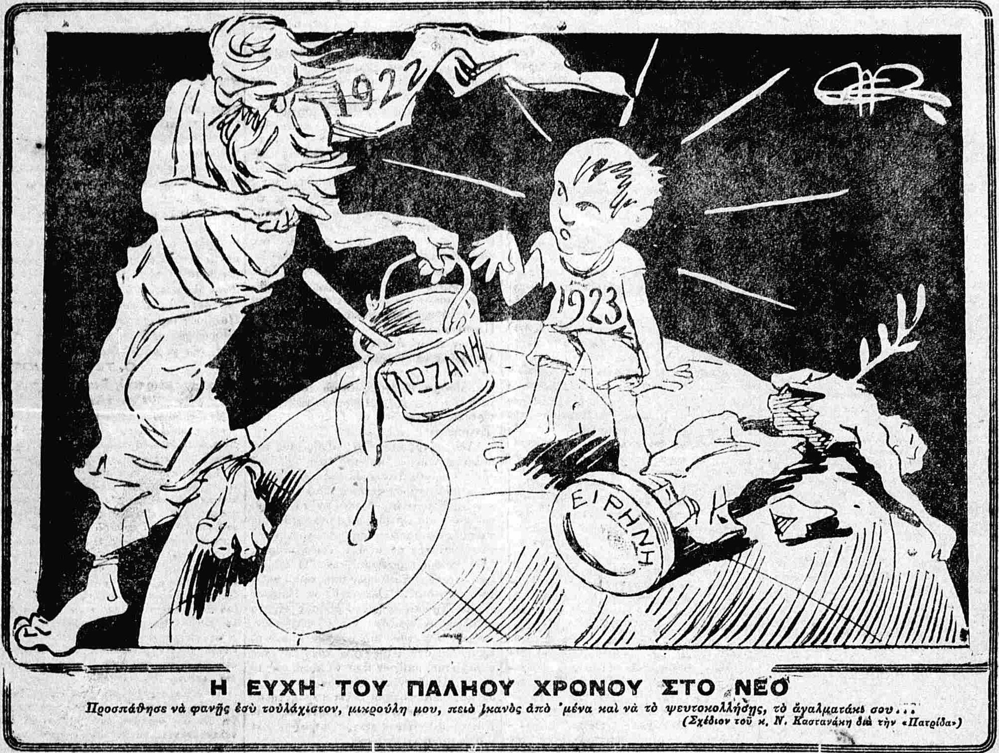Πρωτοχρονιά σήμερα και κατά το επικρατήσαν έθος του «Περί Ιστορίας» θα υποδεχθούμε τον νέο χρόνο με ματιές στον προ εκατονταετίας ελληνικό Τύπο, στην Αθήνα και στη Λευκωσία. Από τις αθηναϊκές εφημερίδες ξεχώρισα φέτος την «Πατρίδα», ένα ιστορικό ελληνικό φύλλο που είχε ιδρυθεί στο Βουκουρέστι από τον Σπ. Σίμο και από την πρώτη δεκαετία του 20ού αιώνα μεταφέρθηκε στην ελληνική πρωτεύουσα. Κεντρική θέση στο πρωτοχρονιάτικο φύλλο του 1923 έχει το σκίτσο του Ν. Καστανάκη, με τον απερχόμενο παληό χρόνο (1922) να παραδίδει έναν κουβά με υγρή κόλλα και την υπογραφή Λωζάνη στον «μικρούλη» διάδοχό του (1923), με την ευχή «να ψευτοκολλήσει το αγαλματάκι του», δηλαδή την κομματιασμένη Ειρήνη. Ένα σκίτσο που αποδίδει τις χαμηλές προσδοκίες της εποχής, στο τέλος του 1922, για τις πιθανότητες μιας στέρεης συμφωνίας ειρήνευσης, τουλάχιστον πιο ανθεκτικής από την Συνθήκη των Σεβρών.
