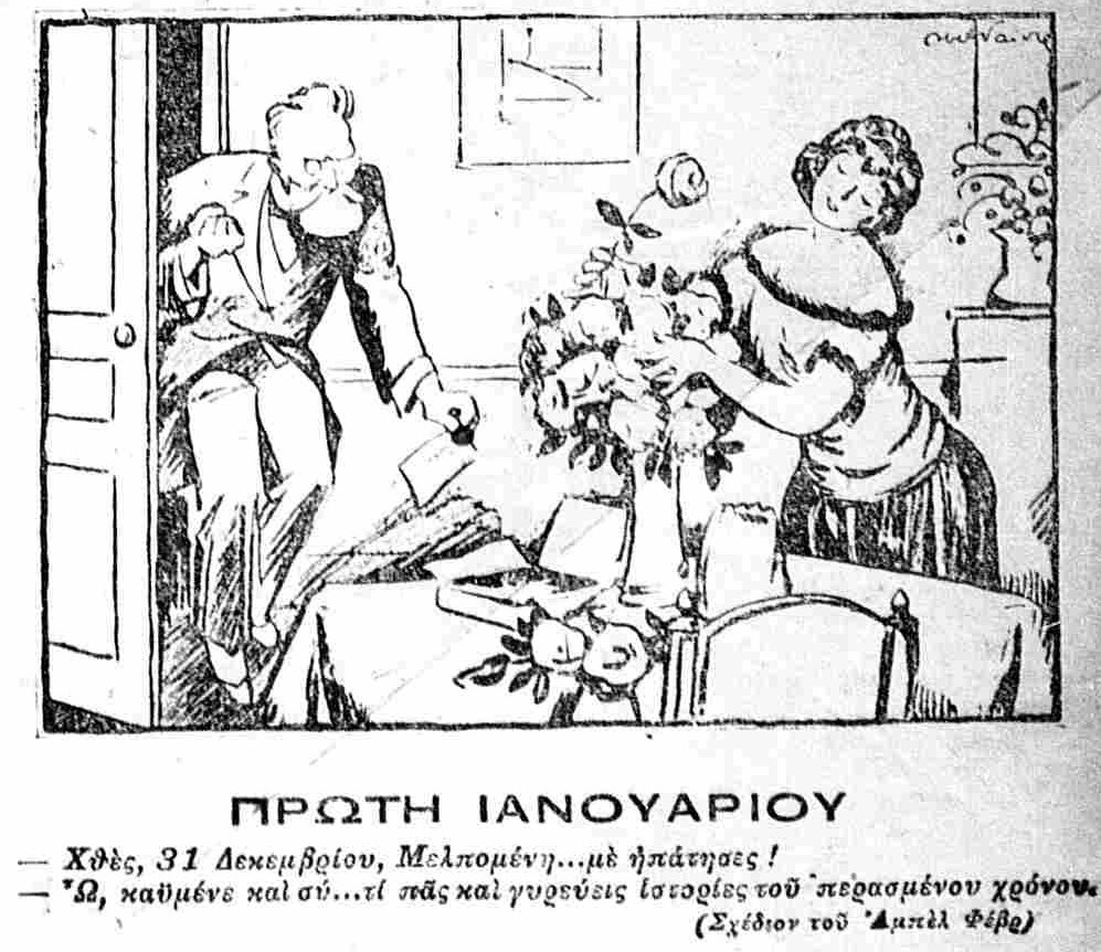 Το πρωτοχρονιάτικο φύλλο του 1923 της «Πατρίδος», ως εορταστικό, διανθίζεται από πολλά σκίτσα. Στην πρώτη σελίδα, εκτός από το κεντρικό πολιτικό σκίτσο ένα δεύτερο, στην κάτω δεξιά γωνία, ξαφνιάζει τον σημερινό αναγνώστη με τη νεωτερικότητά του για την επικρατούσα σοβαροφάνεια. Πρόκειται μάλλον για αντιγραφή από ευρωπαϊκό έντυπο (το υπογράφει ο Άμπελ Φεβρ) και παρουσιάζει ένα σύντομο χαριτωμένο διάλογο, την πρώτη μέρα του χρόνου, ενός απατημένου συζύγου με τη νεοτέρα συμβία του.