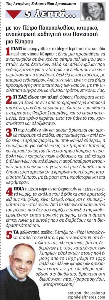 Με την ευκαιρία των δεκάτων γενεθλίων του ιστολογίου αναρτώ ξανά την πρώτη παρουσίασή του, από τη φίλη Αντιγόνη Σολομωνίδου Δρουσιώτου, στον «Φιλελεύθερο» της 8ης Φεβρουαρίου του 2013. (Η φωτογραφία μου είναι του 2004…)