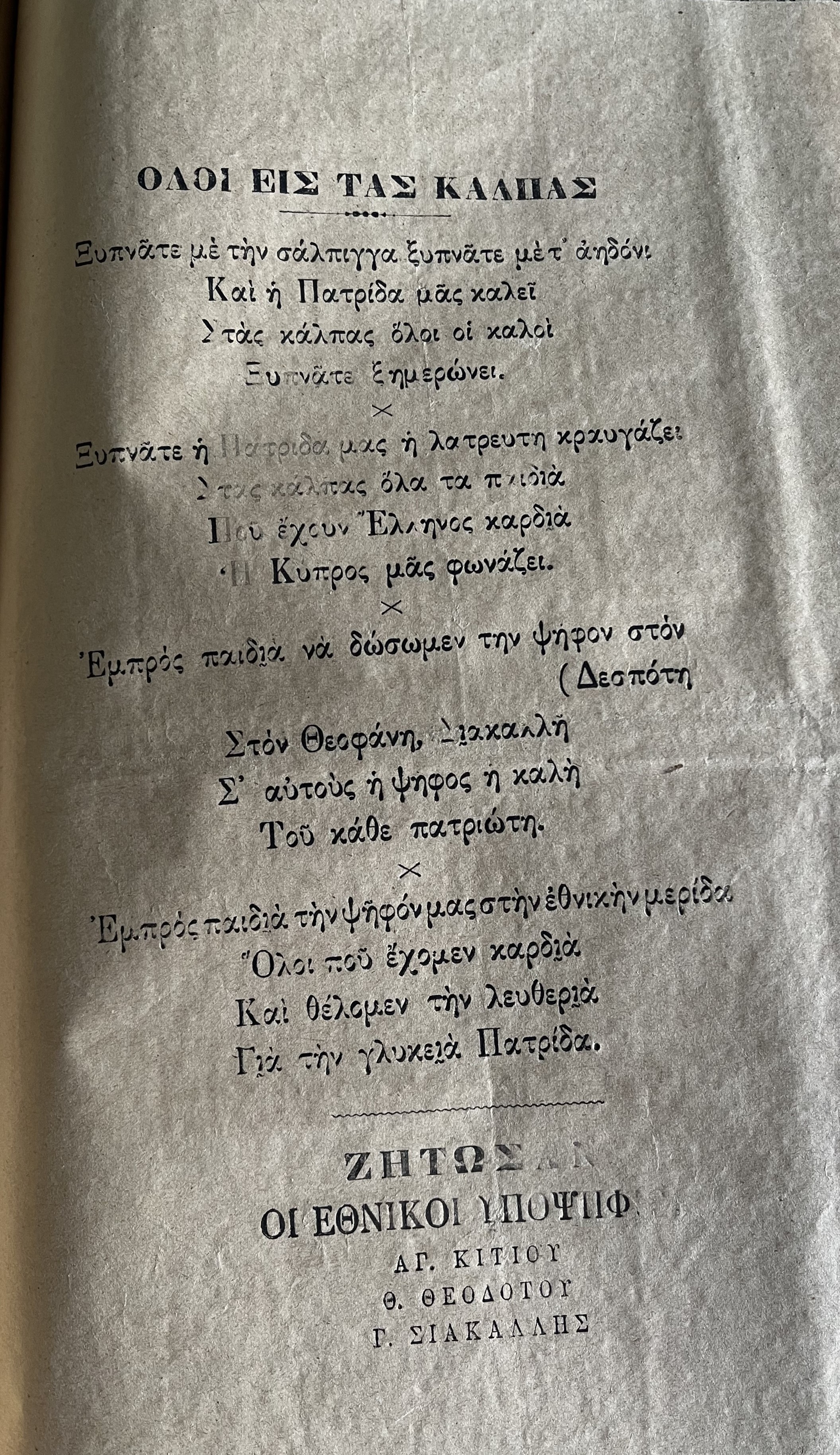 Για τις σημερινές εκλογές δημοσιεύω από το προσωπικό μου αρχείο ένα όμορφο μονόφυλλο του Σεπτεμβρίου του 1901. Κυκλοφόρησε ως παράρτημα της εφημερίδας “Ευαγόρας”, του Νικόλαου Καταλάνου τη μέρα των βουλευτικών εκλογών (Πέμπτη, 27 Σεπτεμβρίου 1901). Ήταν οι πρώτες εκλογές στη νεότερη ιστορία της Κύπρου με τόσο μεγάλο ενδιαφέρον και συμμετοχή και έγιναν σε κλίμα πόλωσης και οξύτητας, εξαιτίας του Αρχιεπισκοπικού ζητήματος. Ο Καταλάνος υποστήριζε στη Λευκωσία τους “εθνικούς υποψηφίους” (μητροπολίτης Κιτίου Κύριλλος Παπαδόπουλος, Θεοφάνης Θεοδότου, Γεώργιος Σιακαλλής και ονόμαζε τους αντίπαλούς τους (ηγούμενος Κύκκου Γεράσιμος, Πασχάλης Κωνσταντινίδης, Αχιλλέας Λιασίδης) “αντεθνικούς” ή “σπειραίους” (δηλαδή μέλη της “σπείρας”). Από την πλευρά τους οι αντίπαλοι του μητροπολίτη Κιτίου ονόμαζαν τον δικό τους συνδυασμό ως “τον αληθώς εθνικόν”. Ωραίες εποχές… [Ας σημειωθεί ότι οι κάλπες άνοιγαν στις 6.30 πμ και έκλειναν στις 6.00 μμ.]