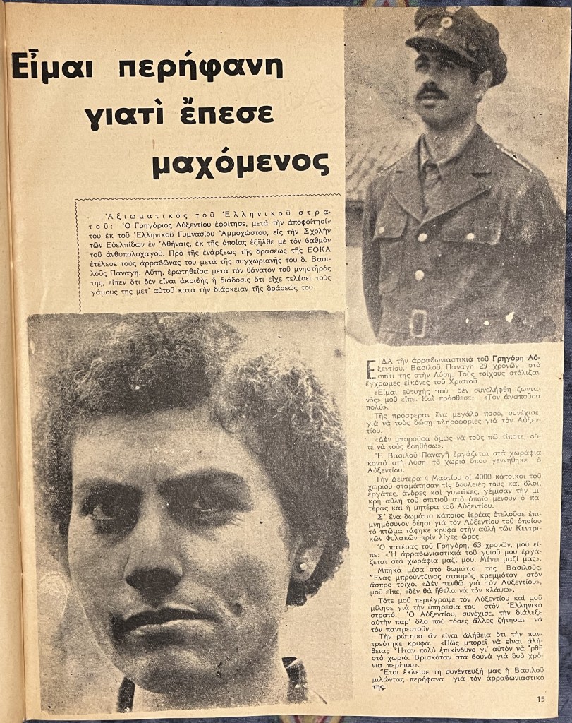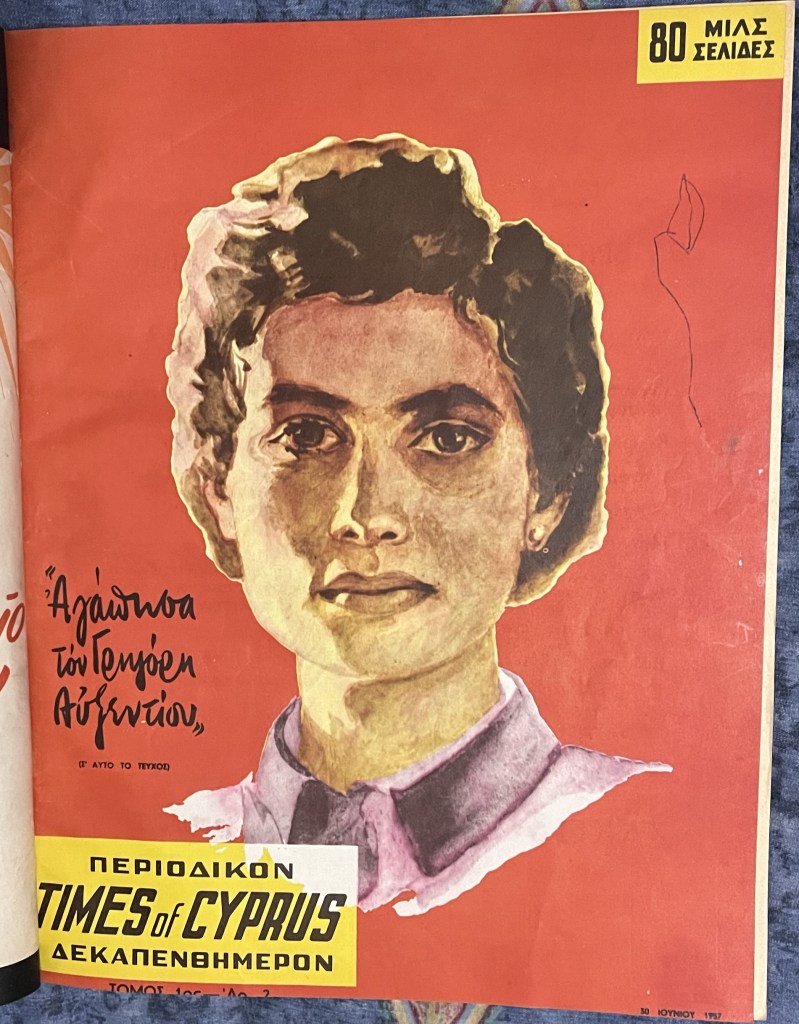 Έφυγε από τη ζωή χτες, 27 Απριλίου 2023, σε ηλικία 95 χρονών, η Βασιλού Παναγή – Παπαδημήτρη, η σύζυγος του Γρηγόρη Αυξεντίου. Στη μνήμη της δημοσιεύω το εξώφυλλο του δεύτερου τεύχους του περιοδικού Times of Cyprus (1 Ιουνίου 1957) και από το πρώτο τεύχος του ίδιου περιοδικού (15 Μαΐου 1957) τις πρώτες δηλώσεις της μετά τον θάνατο του Αυξεντίου στον Μαχαιρά: “Είμαι περήφανη γιατί έπεσε μαχόμενος”. Τότε ο γάμος της με τον Αυξεντίου παρέμενε ακόμη μυστικός (τον αποκάλυψε ο Αρχιεπίσκοπος Μακάριος μετά την επιστροφή του στην Κύπρο από την εξορία, τον Ιούλιο του 1959) και εμφανιζόταν ως αρραβωνιστικιά του ήρωα της ΕΟΚΑ. Η Βασιλού ήταν συνομήλικη με τον Γρηγόρη Αυξεντίου και ήταν εργάτρια γης. [Το περιοδικό “ποικίλης υλης” Times of Cyprus με διευθυντή τον Charles Foley, τυπωνόταν στα τυπογραφεία της Αρχιεπισκοπής και είχε μοναδική κυκλοφοριακή επιτυχία στην ιστορία της κυπριακής δημοσιογραφίας, καθώς έμπαινε σε όλα τα κυπριακά σπίτια.)