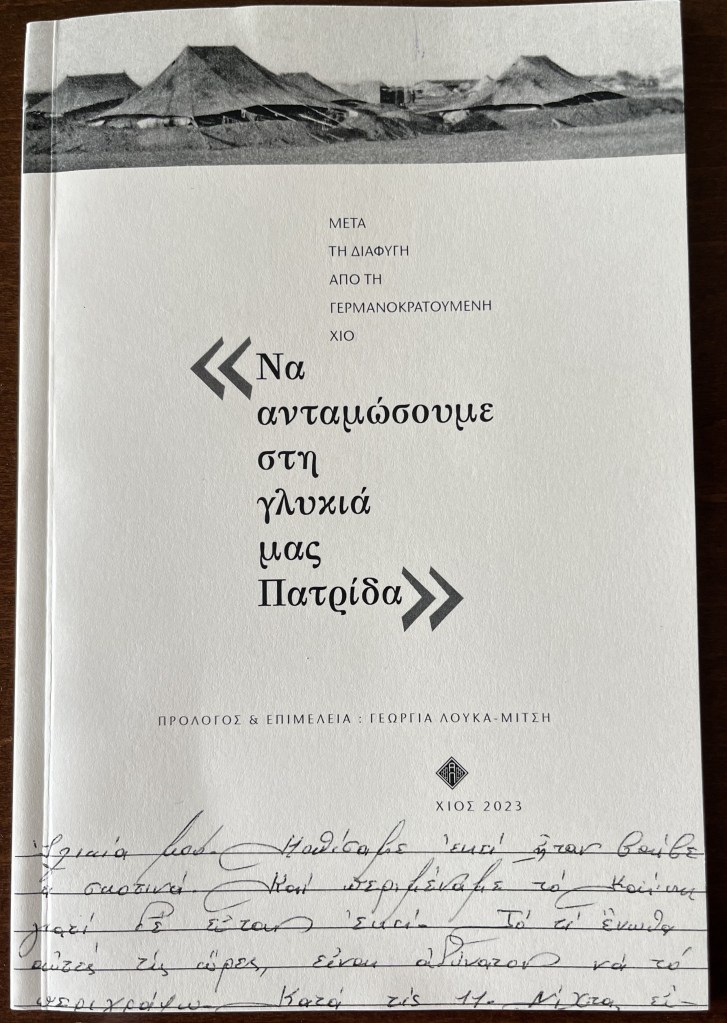 Πριν μερικές μέρες παρέλαβα με συγκίνηση από τη Χίο ένα όμορφο βιβλιαράκι, με πρόλογο και επιμέλεια της Γεωργίας Λουκά – Μίτση και τίτλο “Να ανταμώσουμε στη γλυκιά μας πατρίδα” (Χίος, Απρίλιος 2023). Με την κυρία Γεωργία Μίτση και τον σύζυγό της, Νίκο, είχαμε γνωριστεί πριν από επτά χρόνια στη Χίο, σε ένα συνέδριο για τον Κωνσταντίνο Άμαντο. Είχα αναφέρει τότε στην ανακοίνωσή μου και για τους δεσμούς της Κύπρου με τη Χίο στην προσφυγιά της Κατοχής από την Ελλάδα στη Μέση Ανατολή, λόγω του λιμού, ένα από τα αγαπημένα ερευνητικά μου θέματα, και η κυρία Μίτση μου είχε πει ότι η οικογένεια του πατέρα της είχε καταφύγει στο νησί μας, όπως εκατοντάδες άλλες φαμίλιες από τη Χίο, τη Σάμο, την Ικαρία και άλλα νησιά του Β.Α. Αιγαίου. Και ότι είχαν σωθεί κοντά της χειρόγραφα και φωτογραφίες από την έξοδο και τις περιπέτειες της οικογένειάς τους κατά το 1942-1945.