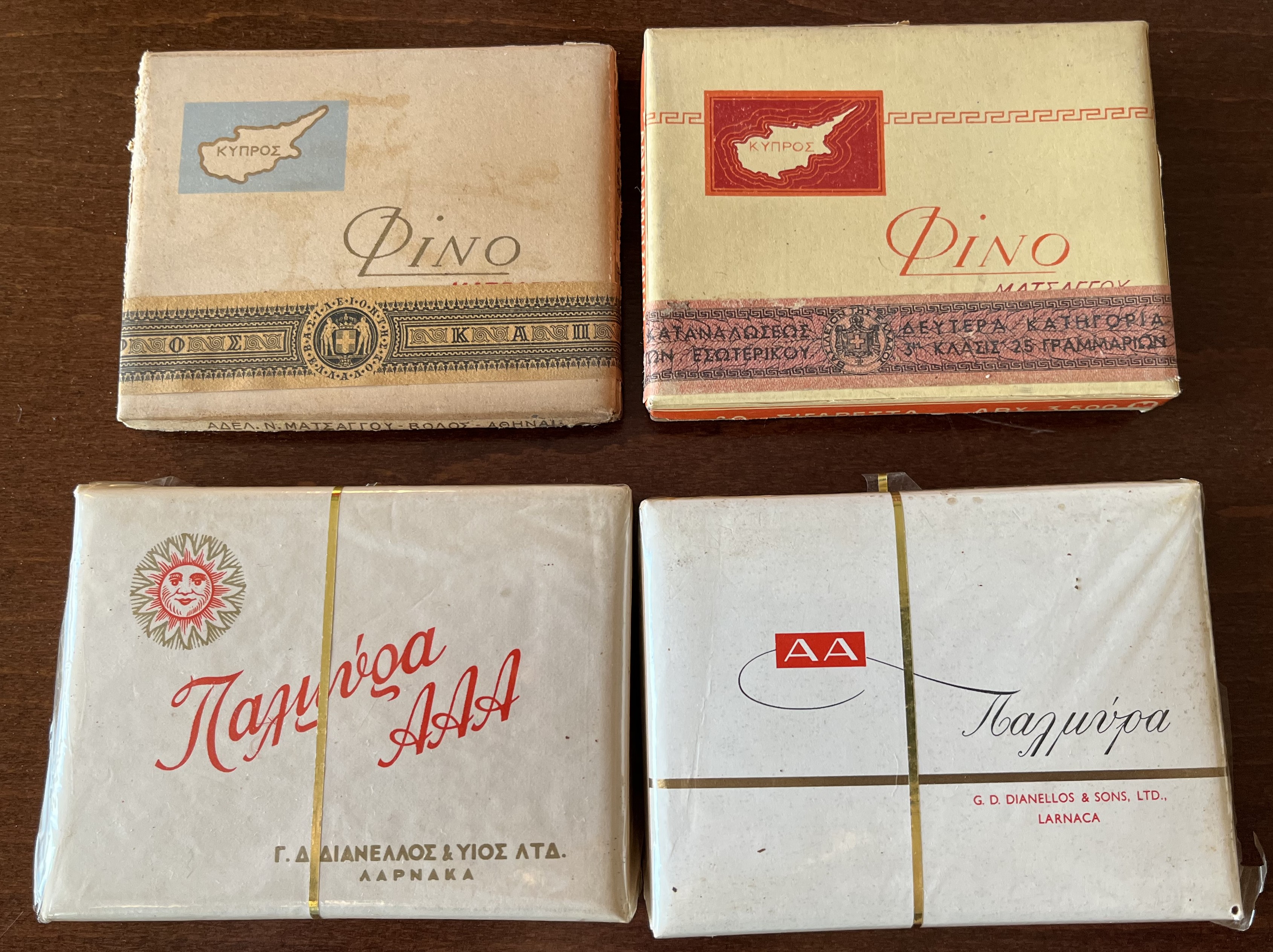 Στη φωτογραφία, από τη συλλογή μου, τέσσερα πακέτα τσιγάρων της δεκαετίας του 1950. Δύο ελλαδικά, του Ματσάγγου, με την Κύπρο στην μπροστινή όψη του πακέτου και δύο του Γ. Δ. Διανέλλου, καπνοβιομηχανίας της Λάρνακας, το “Παλμύρα ΑΑ” και το πολυτελέστερο “Παλμύρα ΑΑΑ”. Και οι δυο τους, Ματσάγγος και Διανέλλος, όπως και άλλοι από τους πρώτους καπνοβιομήχανους της Κύπρου (Βεργόπουλος, Πούλιας, κ.ά.) ήταν Πηλιορείτες.