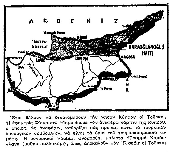 Η φωτογραφία από το πρωτοσέλιδο της εφημ. «Μακεδονία» της Θεσσαλονίκης, την Κυριακή 11 Αυγούστου 1974, αναπαράγει χάρτη της τουρκικής «Χουρριέτ» της προηγούμενης μέρας με τους τελικούς τουρκικούς στόχους ενώ είχε ξεκινήσει η διάσκεψη της Γενεύης. Όπως φαίνεται η πόλη της Αμμοχώστου («Magosa”) είναι εκτός της γραμμής κατοχής… Στη λεζάντα η ελληνική εφημερίδα ερμηνεύει λανθασμένα το Karaoglanoglu Hattı του χάρτη (γραμμή Καραογλάνογλου) θεωρώντας το ως αναφορά στον πρωθυπουργό της εισβολής ενώ πρόκειται για τον Τούρκο συνταγματάρχη Χαλίλ Ιμπραήμ Καραογλάνογλου που σκοτώθηκε λίγα χιλιόμετρα έξω από την Κερύνεια στις 21 Ιουλίου 1974 κι όταν το τουρκικό προγεφύρωμα ήταν ακόμη ελάχιστο.
