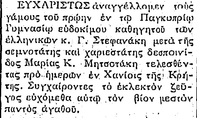 Η πρώτη σχέση της οικογένειας Μητσοτάκη που καταγράφεται με την Κύπρο ήταν η υπηρεσία στη Λευκωσία και στο Παγκύπριο Γυμνάσιο για δύο χρόνια (1905-1907) του φιλόλογου καθηγητή Γεώργιου Στεφανάκη, που ήρθε στο νησί μας μετά την έκρηξη του κινήματος στο Θέρισο. Άφησε άριστες εντυπώσεις στη δύσκολη περίοδο του Αρχιεπισκοπικού Ζητήματος, και εκφώνησε μερικούς εξαιρετικούς πανηγυρικούς στη Λευκωσία. Σώζεται και ένα άρθρο του σε κυπριακή εφημερίδα που συστήνει ομόνοια στους πολιτευτές των δύο νησιών… Τον Σεπτέμβριο του 1907, αμέσως μετά την οριστική αναχώρησή του από το Παγκύπριο Γυμνάσιο, η λευκωσιάτικη εφημερίδα «Ελευθερία» ανήγγειλε τους γάμους του στα Χανιά μετά της σεμνοτάτης και χαριεστάτης δεσποινίδος Μαρίας Κ. Μητσοτάκη. Η σύζυγος του Στεφανάκη, Μαρία (1882-1935) ήταν το δεύτερο (πρώτο ουσιαστικά αφού το προηγούμενο είχε πεθάνει σε νηπιακή ηλικία) από τα οκτώ παιδιά της αδελφής του Ελευθερίου Βενιζέλου Αικατερίνης (Κατίγκως) και του δικηγόρου, πολιτευτή και εκδότη της εφημερίδας των Χανίων «Λευκά Όρη» Κωνσταντίνου (Κωστή) Κ. Μητσοτάκη (1843-1898). Γιος του Γιώργου Στεφανάκη και της Μαρίας Μητσοτάκη ήταν και ο Κωνσταντίνος Στεφανάκης, βουλευτής και υπουργός στις δεκαετίες του 1960 και 1970.