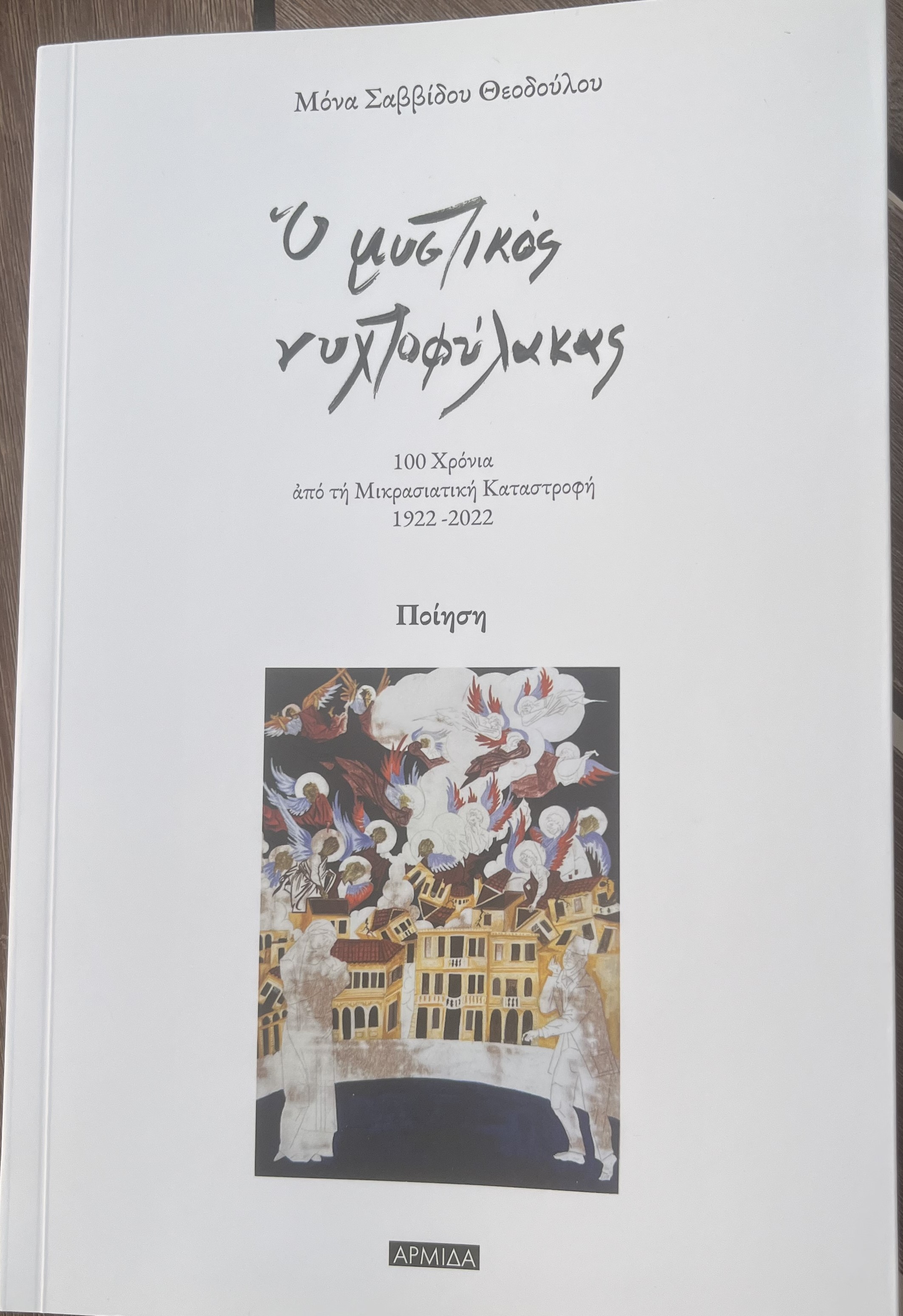 Πριν από λίγους μήνες κυκλοφόρησε η νέα ποιητική συλλογή της Μόνας Σαββίδου Θεοδούλου, γνωστής Λεμεσιανής φιλολόγου και λογοτέχνιδος, με μικρασιατικές ρίζες, προέδρου από την ίδρυσή του (2010) του «Συνδέσμου Μικρασιατών Κύπρου». Τίτλος: «Ο μυστικός νυχτοφύλακας. 100 Χρόνια από τη Μικρασιατική Καταστροφή 1922-2022» (εκδόσεις Αρμίδα, Λευκωσία 2023, σελ. 69).