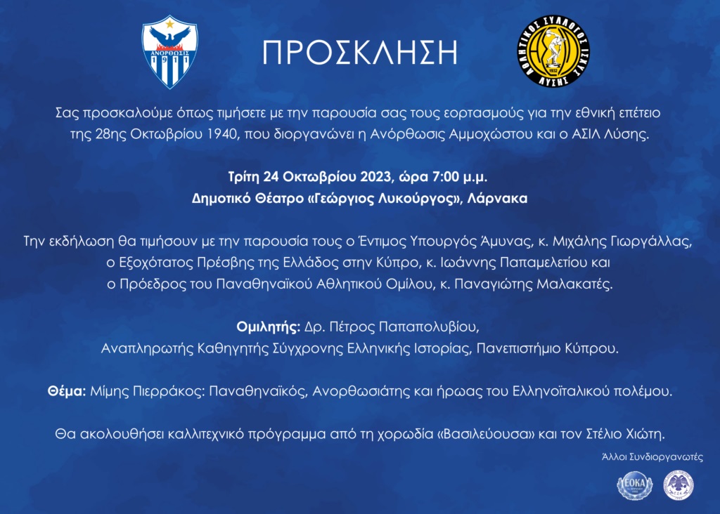 Σήμερα, 24 Οκτωβρίου 2023, στις 7.00 μμ το απόγευμα, στο Δημοτικό Θεάτρο “Γεώργιος Λυκούργος” στη Λάρνακα, η Ανόρθωσις Αμμοχώστου και ο ΑΣΙΛ Λύσης οργανώνουν εκδήλωση για να τιμήσουν την επέτειο της 28ης Οκτωβρίου 1940. Στην εκδήλωση θα μιλήσω με θέμα “Μίμης Πιερράκος: Παναθηναϊκός, Ανορθωσιάτης και ήρωας του Ελληνοϊταλικού πολέμου”.