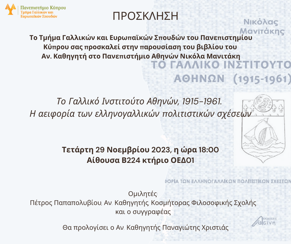Παρουσιάζεται σήμερα, Τετάρτη 29 Νοεμβρίου 2023, στις 18.00, στο Πανεπιστήμιο Κύπρου (Αίθουσα Β224, κτήριο ΟΕΔ01) το βιβλίο του ιστορικού Νικόλα Μανιτάκη με τίτλο “Το Γαλλικό Ινστιτούτο Αθηνών, 1915-1961. Η αειφορία των ελληνογαλλικών πολιτιστικών σχέσεων” (Αθήνα: Ασίνη 2022). Την εκδήλωση θα ανοίξει χαιρετισμός της προέδρου του Τμήματος Γαλλικών και Ευρωπαϊκών Σπουδών του Πανεπιστημίου Κύπρου, Φρύνης Κακογιάννη-Ντοά και για το βιβλίο θα μιλήσουν ο συγγραφέας του και εγώ, με συντονιστή τον Παναγιώτη Χριστιά.