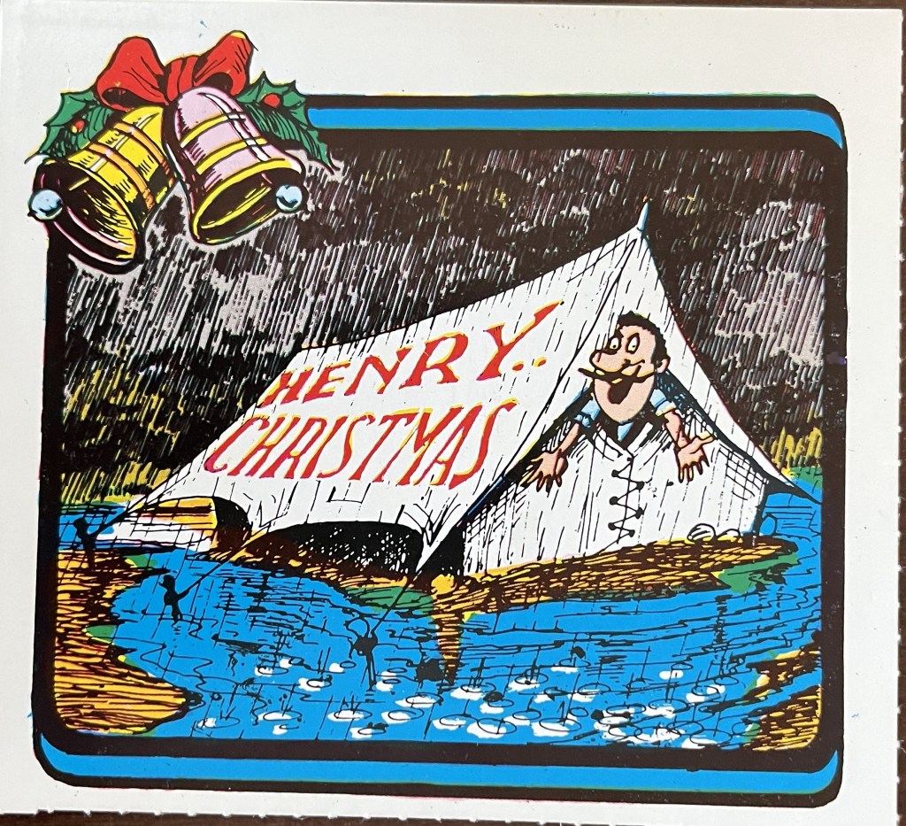 Η δεύτερη γελοιογραφία έχει πιο ανθρώπινο χρώμα και εντάσσεται στη μεταεισβολική χριστουγεννιάτικη περίοδο. Η αγαπημένη φιγούρα του Μαυρογένη, ένας μουστακαλής, που αντιπροσωπεύει τον μέσο Κύπριο, προβάλλει από ένα προσφυγικό αντίσκηνο, πλημμυρισμένο από τη βαριά βροχή που έχει κάνει λίμνη τον εξωτερικό χώρο και στέλλει τις χριστουγεννιάτικές του ευχές “λογο-παίζοντας” με το όνομα του Κίσινγκερ, ο οποίος υποδεικνύεται, έτσι, ως ο βασικός αίτιος της συμφοράς. Το χαμόγελο του εικονιζόμενου πρόσφυγα, όμως, μεταφέρει (και στον Κίσινγκερ – ως προσωποποίηση των εχθρών της Κύπρου) μήνυμα αισιοδοξίας και αντίστασης.