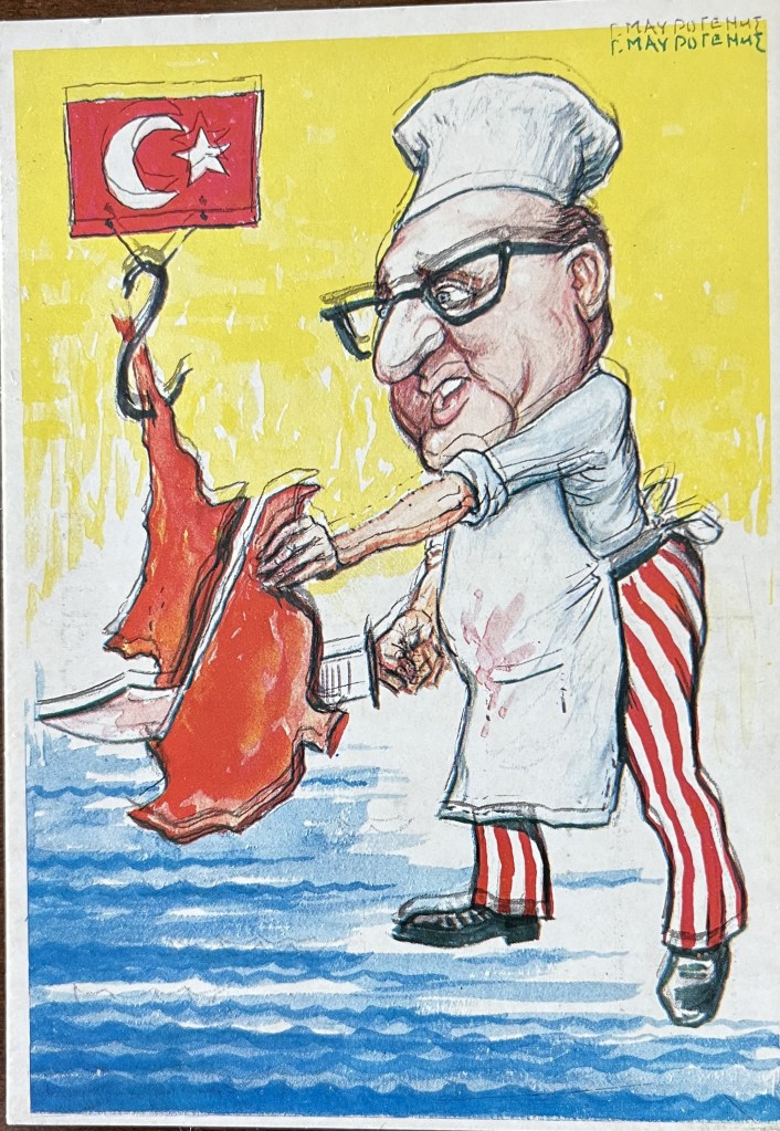 Από την προσωπική συλλογή μου δημοσιεύω δύο σατιρικά καρτ ποστάλ, που κυκλοφόρησαν μετά την τουρκική εισβολή στην Κύπρο, δια χειρός του Γιώργου Μαυρογένη, του κορυφαίου πολιτικού γελοιογράφου στις πρώτες δεκαετίες ζωής της Κυπριακής Δημοκρατίας. Ανάλογες γελοιογραφίες στον κυπριακό και ελλαδικό Τύπο εντοπίζονται κατά δεκάδες, ειδικά στην περίοδο 1974-1976.