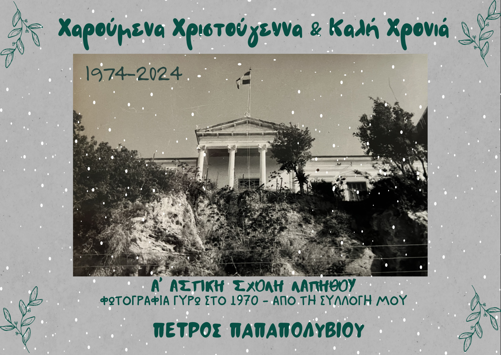 Η φωτογραφία της φετινής χριστουγεννιάτικης κάρτας μου είναι μια σπάνια λήψη του Δημοτικού Σχολείου Λαπήθου (“Α΄ Αστικής Σχολής”), στην ενορία του Αποστόλου Λουκά, στον βράχο πάνω από το Δημαρχείο της Λαπήθου και την Πλατεία Ηρώων. Είναι το σχολείο όπου φοίτησα κατά το 1966-1972.