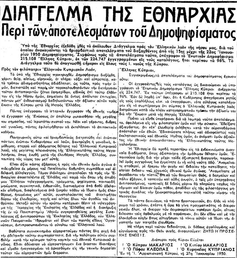 Σύμφωνα με την ανακοίνωση της Ιεράς Συνόδου της Εκκλησίας της Κύπρου (27 Ιανουαρίου 1950), που δημοσιεύθηκε στις κυπριακές εφημερίδες την Κυριακή, 29 Ιανουαρίου 1950 («Διάγγελμα της Εθναρχίας. Περί των αποτελεσμάτων του Δημοψηφίσματος», το Δημοψήφισμα είχε τα εξής αποτελέσματα: