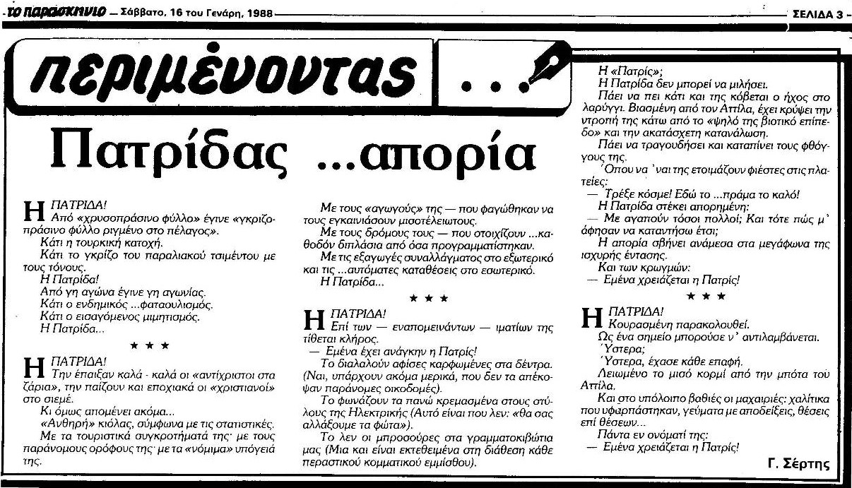Από τα χιλιάδες χρονογραφήματά του εκλιπόντος, ένα τυχαίο δείγμα της περιόδου του “Παρασκηνίου”, στο φύλλο της 16ης Ιανουαρίου 1988. Τίτλος, ¨Πατρίδας …απορία”