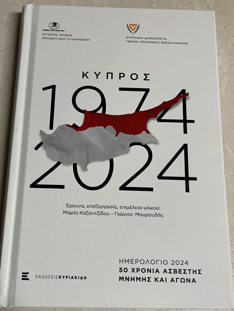 Κυκλοφόρησε πριν από μερικές βδομάδες στη Θεσσαλονίκη, από τις εκδόσεις Κυριακίδη, το Ημερολόγιο Κύπρος, 1974-2024. Το Ημερολόγιο αποτελεί συνέκδοση του Ιστορικού Αρχείου Προσφυγικού Ελληνισμού (ΙΑΠΕ) του Δήμου Καλαμαριάς και του Προξενείου της Κυπριακής Δημοκρατίας στη Θεσσαλονίκη. Η έρευνα, επεξεργασία και επιμέλεια της έκδοσης ανήκει στη Μαρία Καζαντζίδου και στον Γιώργο Μαυρουδή. Της έκδοσης προτάσσεται χαιρετισμός του Πρόξενου της Κύπρου στη Θεσσαλονίκη, Κωνσταντίνου Πολυκάρπου και δικός μου πρόλογος. Ο Δήμος Καλαμαριάς, ένας από τους μεγαλύτερους προσφυγικούς δήμους στην Ελλάδα, όπως είναι γνωστό διατηρεί και συντηρεί διαχρονικά πολύχρονους και ποικίλους στέρεους δεσμούς με την Κύπρο.
