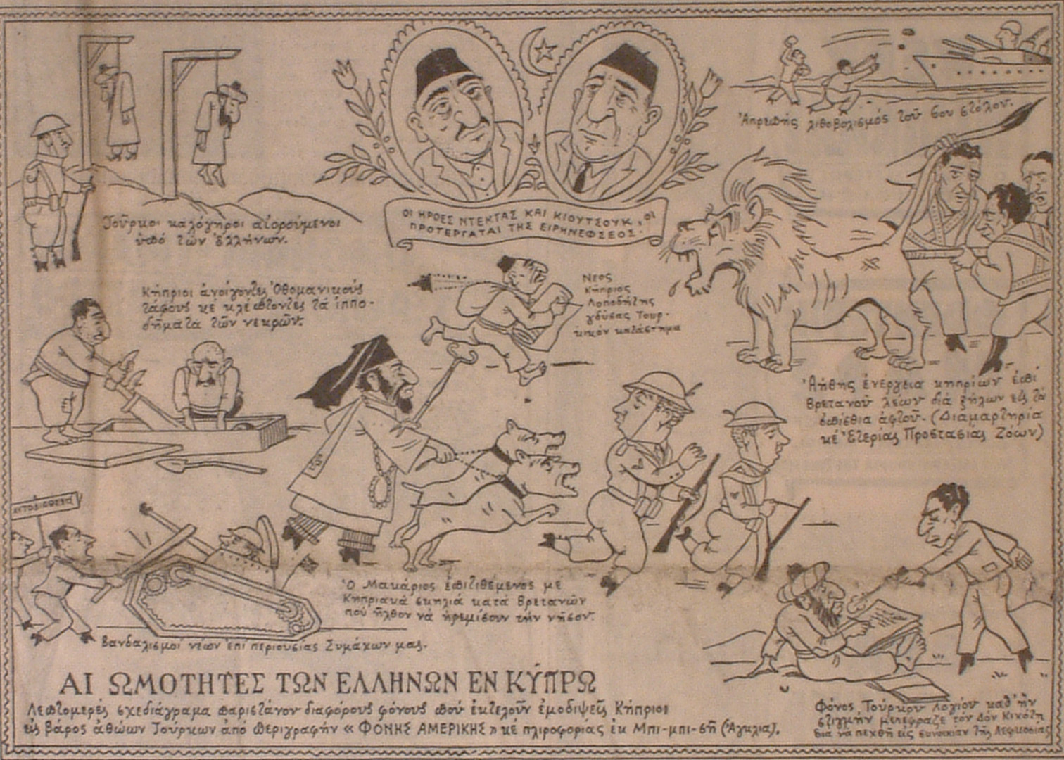 Πρόκειται, όπως αναφέρει κάτω αριστερά η λεζάντα, σε «Λεπτομερές σχεδιάγραμα παριστάνον διαφόρους φόνους που εκτελούν εμοδιψείς Κήπριοι εις βάρος αθώων Τούρκων από περιγραφήν «ΦΟΝΗΣ ΑΜΕΡΙΚΗΣ» κε πληροφορίας εκ Μπι-μπι-ση (Αγκλία).»