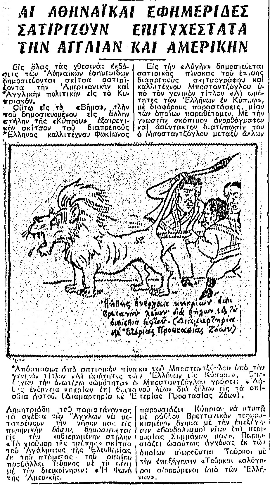 Αξίζει να προστεθεί η απήχηση της συγκεκριμένης γελοιογραφίας στην Κύπρο: Την επομένη, 2 Μαρτίου 1964, δημοσιεύθηκε τμήμα της στην πρώτη σελίδα της εβδομαδιαίας (δευτεριάτικης) εφημερίδας «Κύπρος», που στάθηκε στην αντιβρετανική και αντιαμερικανική σάτιρα του αθηναϊκού Τύπου (βλ. παρακάτω). Τέλος, στις 3 Μαρτίου 1964, στην εφημ. «Χαραυγή», το καθημερινό δημοσιογραφικό όργανο του ΑΚΕΛ, δημοσιεύθηκε πρωτοσέλιδα η γελοιογραφία (βλ. παρακάτω) με τη λεζάντα: «Ο Μποστ ειρωνεύεται στην αθηναϊκή «Αυγή» τους συκοφάντες της Κύπρου».