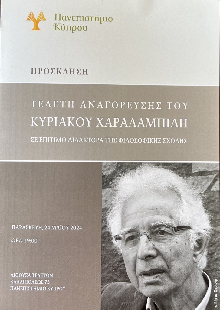 Η Φιλοσοφική Σχολή, η Σύγκλητος και το Συμβούλιο του Πανεπιστημίου Κύπρου έχουν την τιμή να σας προσκαλέσουν στην Τελετή Αναγόρευσης του Κυριάκου Χαραλαμπίδη σε Επίτιμο Διδάκτορα της Φιλοσοφικής Σχολής.