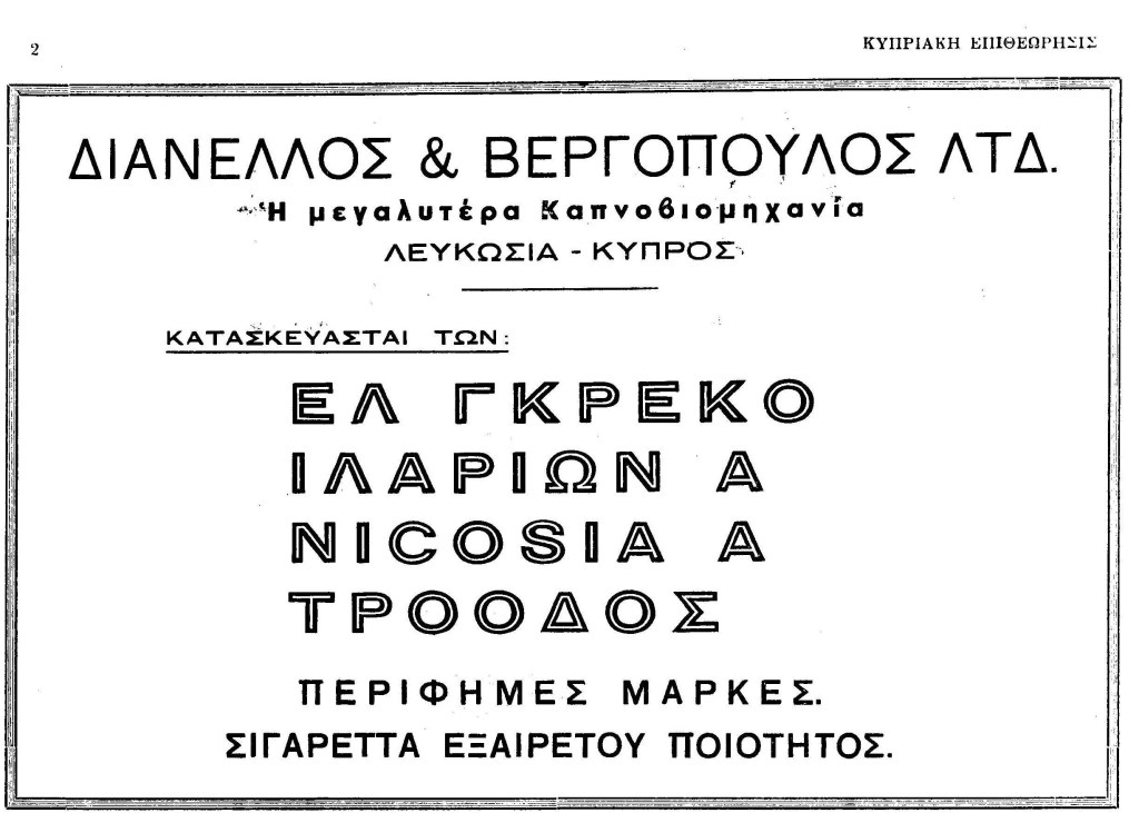 Διαφήμιση τσιγάρων της Καπνοβιομηχανίας Διανέλλος & Βεργόπουλος, στο περιοδικό “Κυπριακή Επιθεώρησις” του 1945
