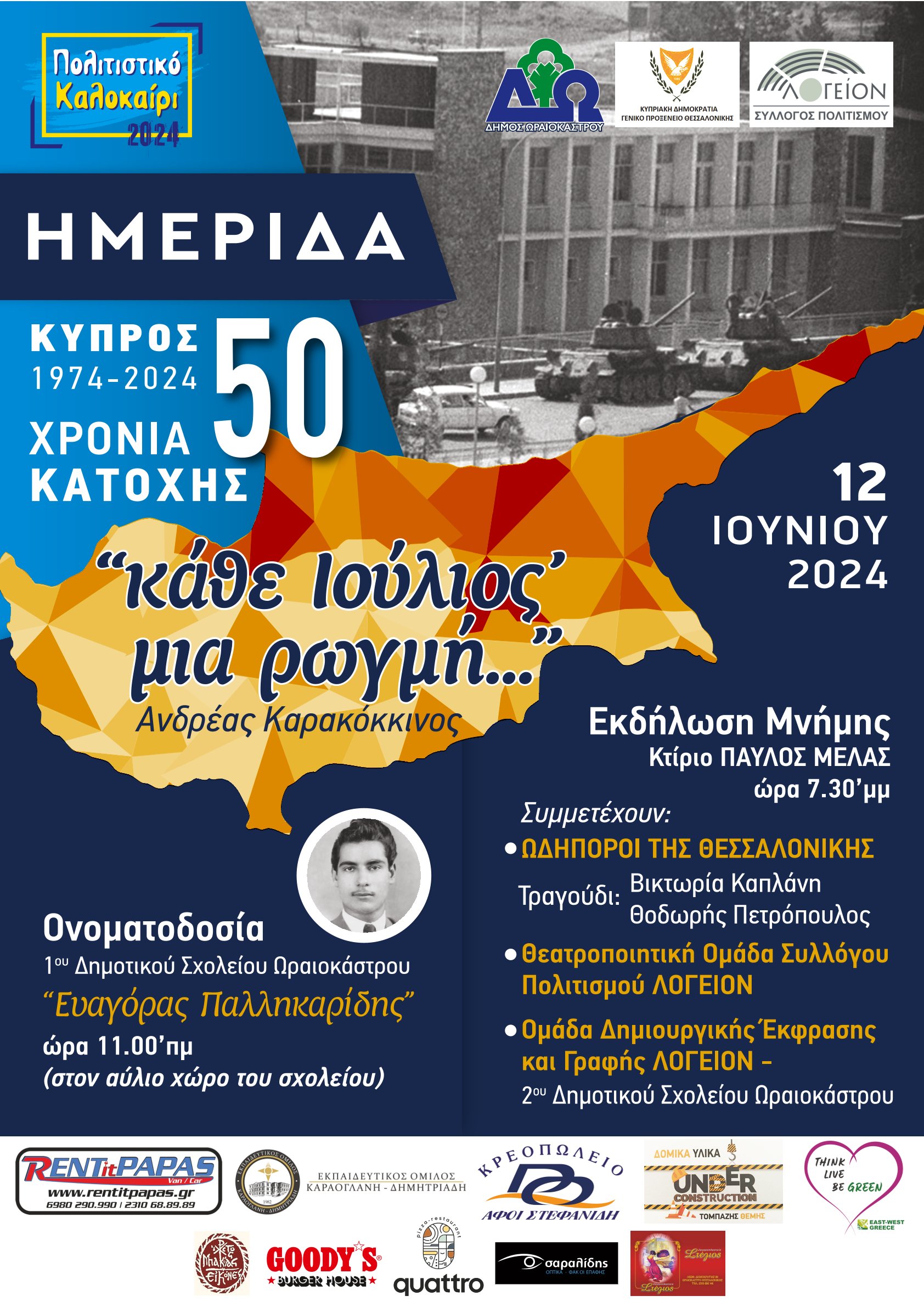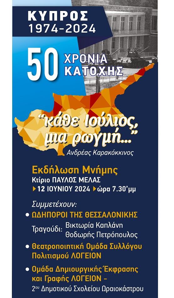 Το απόγευμα της ίδιας ημέρας (Τετάρτη 12 Ιουνίου 2024), στις 19.30, στην Αίθουσα Πολιτισμού «Νέλλυ Δελή» στο Κτίριο «Παύλος Μελάς» (Μακεδονικού Αγώνα 7, Παλαιόκαστρο), θα πραγματοποιηθεί εκδήλωση με τίτλο «Κύπρος: 1974-2024, 50 χρόνια κατοχής». Θα χαιρετίσουν ο Πρόξενος της Κύπρου στη Θεσσαλονίκη, Κωνσταντίνος Πολυκάρπου, ο Δήμαρχος Ωραιοκάστρου, Παντελής Τσακίρης, ενώ την εκδήλωση θα προλογίσει η Αναστασία Καραογλάνη, πρόεδρος του Συλλόγου Πολιτισμού «Λογείον». Θα ακολουθήσουν σύντομες ομιλίες του Πέτρου Παπαπολυβίου και του Δημήτριου Αλευρομάγειρου, στρατηγού ε.α., διοικητή του 366 Τ.Ε. στη διάρκεια της τουρκικής εισβολής στην Κύπρο.
