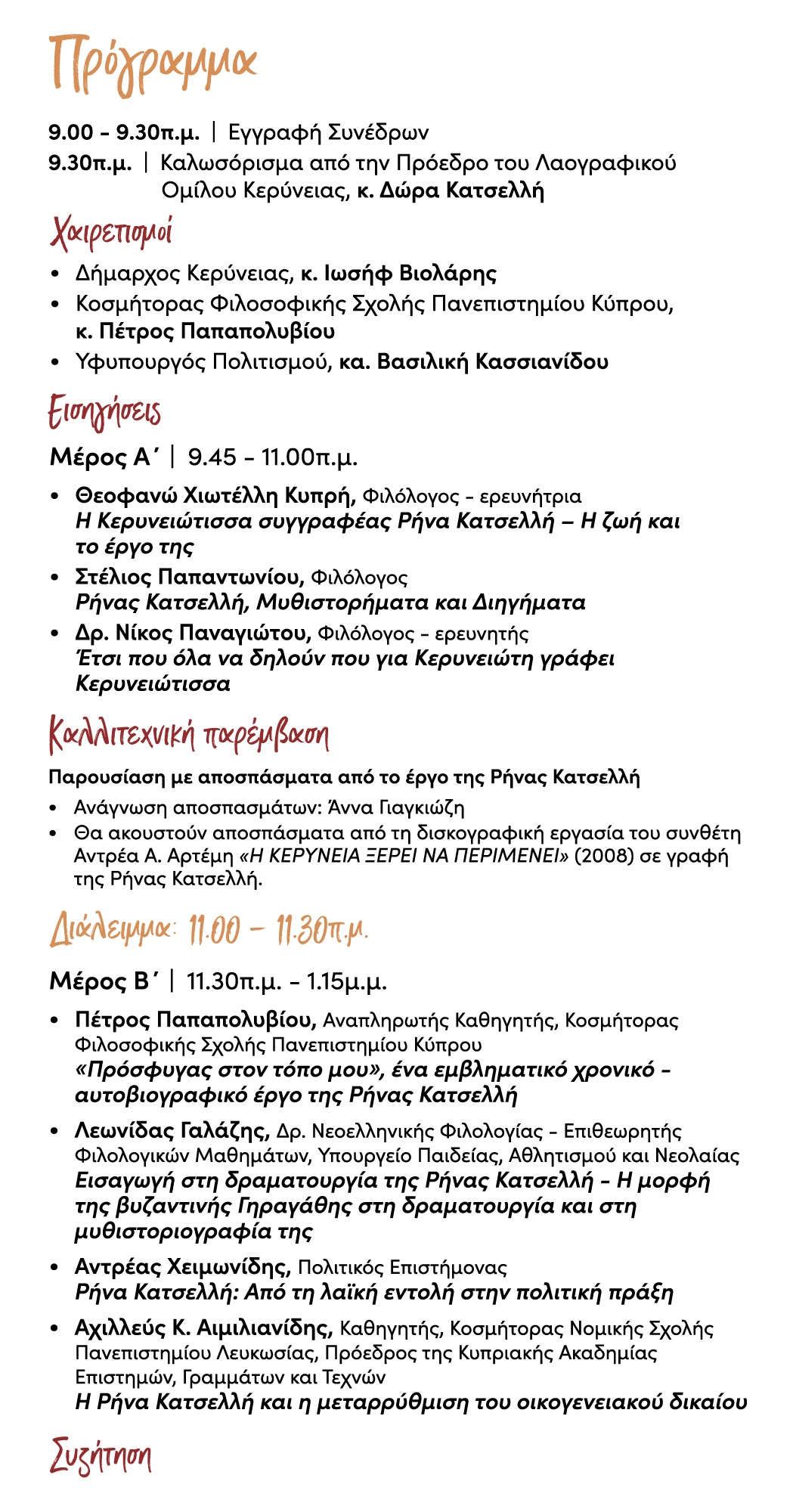 Θα ακολουθήσουν ανακοινώσεις για τη ζωή και το έργο της Ρήνας Κατσελλή από τους Θεοφανώ Χιωτέλλη Κυπρή, Στέλιο Παπαντωνίου, Νίκο Παναγιώτου, Πέτρο Παπαπολυβίου, Λεωνίδα Γαλάζη, Αντρέα Χειμωνίδη και Αχιλλέα Κ. Αιμιλιανίδη.