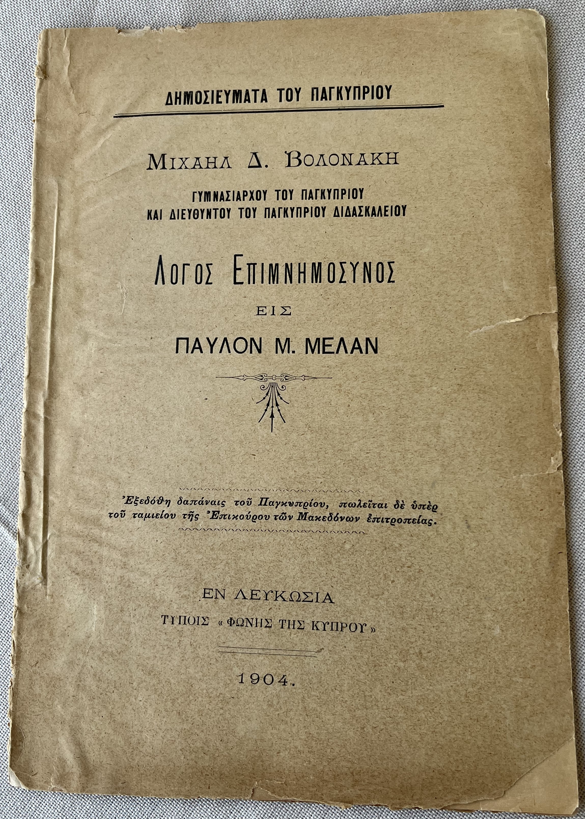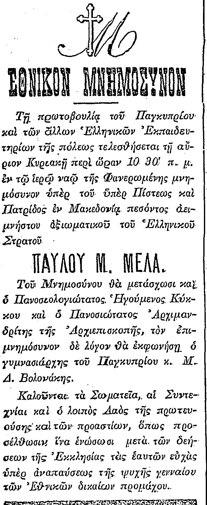 Σημειώνεται ότι η αγγελία του μνημοσύνου αναφέρει την ιδιότητα του Παύλου Μελά (αξιωματικός του ελληνικού στρατού). Στο μνημόσυνο της Φανερωμένης προσήλθαν με τις ελληνικές σημαίες οι μαθητές των σχολείων της Λευκωσίας και οι μαθήτριες του Παρθεναγωγείου. Ο Βολονάκης φρόντισε να τυπωθεί σε πολλά αντίτυπα η φωτογραφία του Μελά με τη στρατιωτική του στολή, η οποία μοιράστηκε στο εκκλησίασμα. Ένα μήνα αργότερα, στα τέλη Νοεμβρίου τυπώθηκε και η ομιλία του Γυμνασιάρχη στο μνημόσυνο (βλ. τη φωτογραφία του εξωφύλλου, από τη βιβλιοθήκη μου). Τα έσοδα από τις πωλήσεις του επιμνημοόσυνου λόγου στάλθηκαν στην Αθήνα, υπέρ των χηρών και των ορφανών των πεσόντων στη Μακεδονία. Αντίστοιχα, στη χήρα του “Μίκη Ζέζα”, Ναταλία Π. Μελά, στάλθηκαν πολλά συλλυπητήρια τηλεγραφήματα από την Κύπρο.