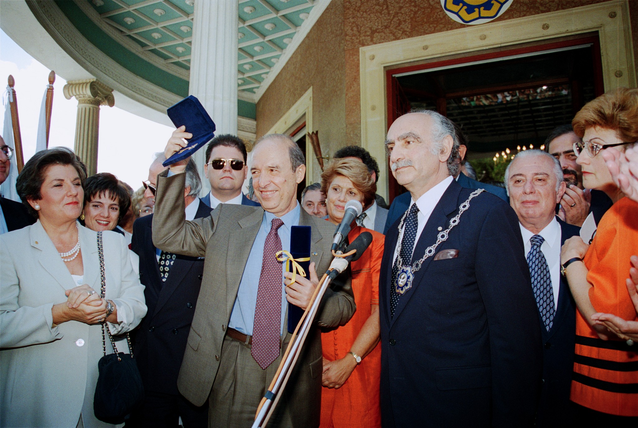 Στη φωτογραφία (Γραφείο Τύπου και Πληροφοριών) ο Κώστας Σημίτης παραλαμβάνει από τον Δήμαρχο Λευκωσίας Λέλλο Δημητριάδη το χρυσό κλειδί της πόλης.