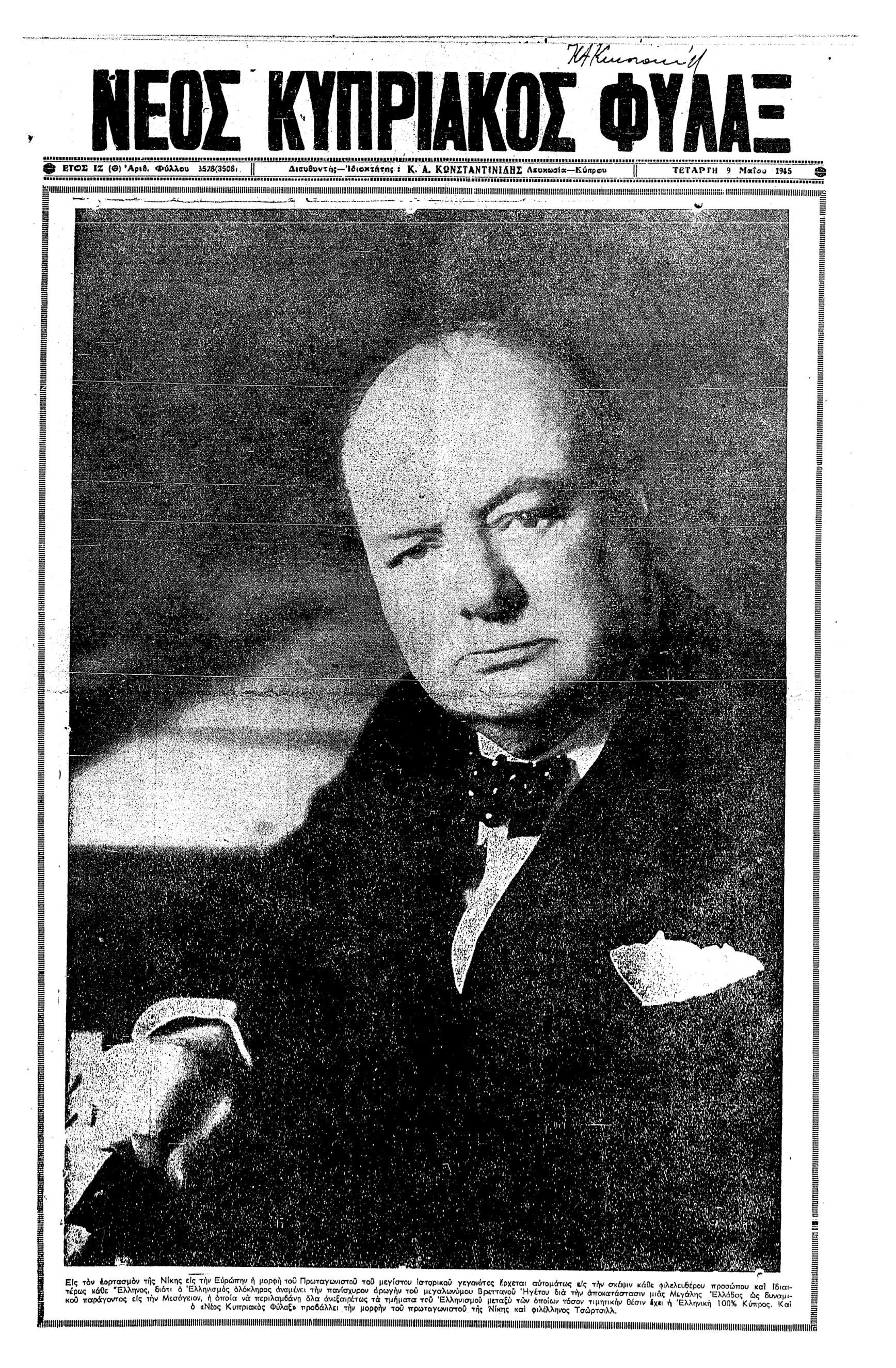 Το εντυπωσιακό πρωτοσέλιδο του “Νέου Κυπριακού Φύλακος” της 9ης Μαΐου 1945 παρουσιάζει στη λεζάντα του τι ανέμεναν οι Έλληνες της Κύπρου από το τέλος του πολέμου και από τον “φιλέλληνα Τσώρτσιλλ”…
