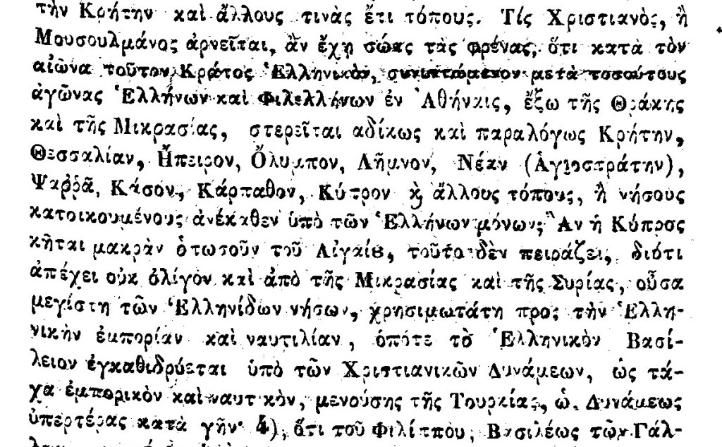 “Τις Χριστιανός, ή Μουσουλμάνος αρνείται, αν έχη σώας τας φρένας, ότι κατά τον αιώνα τούτον, Κράτος Ελληνικόν, συνιστώμενον μετά τοσαύτους αγώνας Ελλήνων και Φιλελλήνων εν Αθήναις, έξω της Θράκης και της Μικρασίας, στερείται αδίκως και παραλόγως Κρήτην, Θεσσαλίαν, Ήπειρον, Όλυμπον, Λήμνον, Νέαν (Αγιοστράτην), Ψαρρά, Κάσον, Κάρπαθον, Κύπρον και άλλους τόπους, ή νήσους, κατοικουμένους ανέκαθεν υπό των Ελλήνων μόνον; Αν η Κύπρος κήται μακράν οπωσούν του Αιγαίου, τούτο δεν πειράζει, διότι απέχει ουκ ολίγον και από της Μικρασίας και της Συρίας, ούσα μεγίστη των Ελληνίδων νήσων, χρησιμωτάτη προς την Ελληνικήν εμπορίαν και ναυτιλίαν, οπότε το Ελληνικόν Βασίλειον εγκαθιδρύεται υπό των Χριστιανικών Δυνάμεων, ως τάχα εμπορικόν και ναυτικόν, μενούσης της Τουρκίας ως Δυνάμεως υπερτέρας κατά γην.” (η υπογράμμιση δική μου)