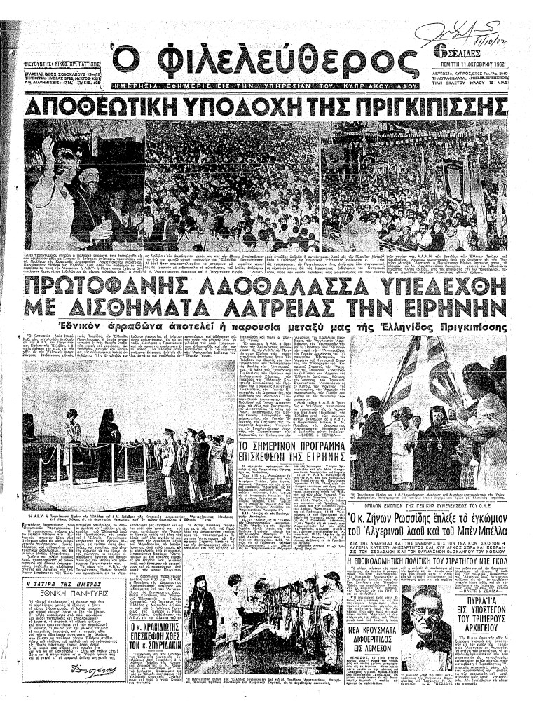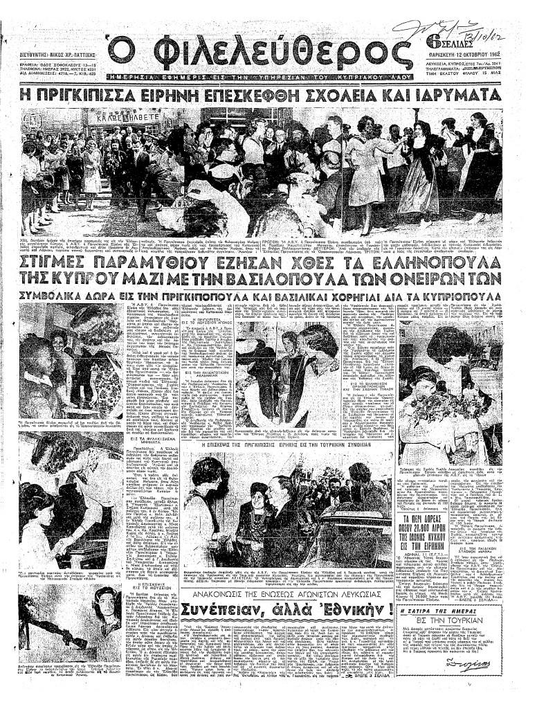 Στο φύλλο του “Φιλελευθέρου” της 12ης Οκτ. 1962 η περιγραφή των επισκέψεων της Ειρήνης στη Λευκωσία και στη Λάρνακα με χαρακτηριστικές φωτογραφίες