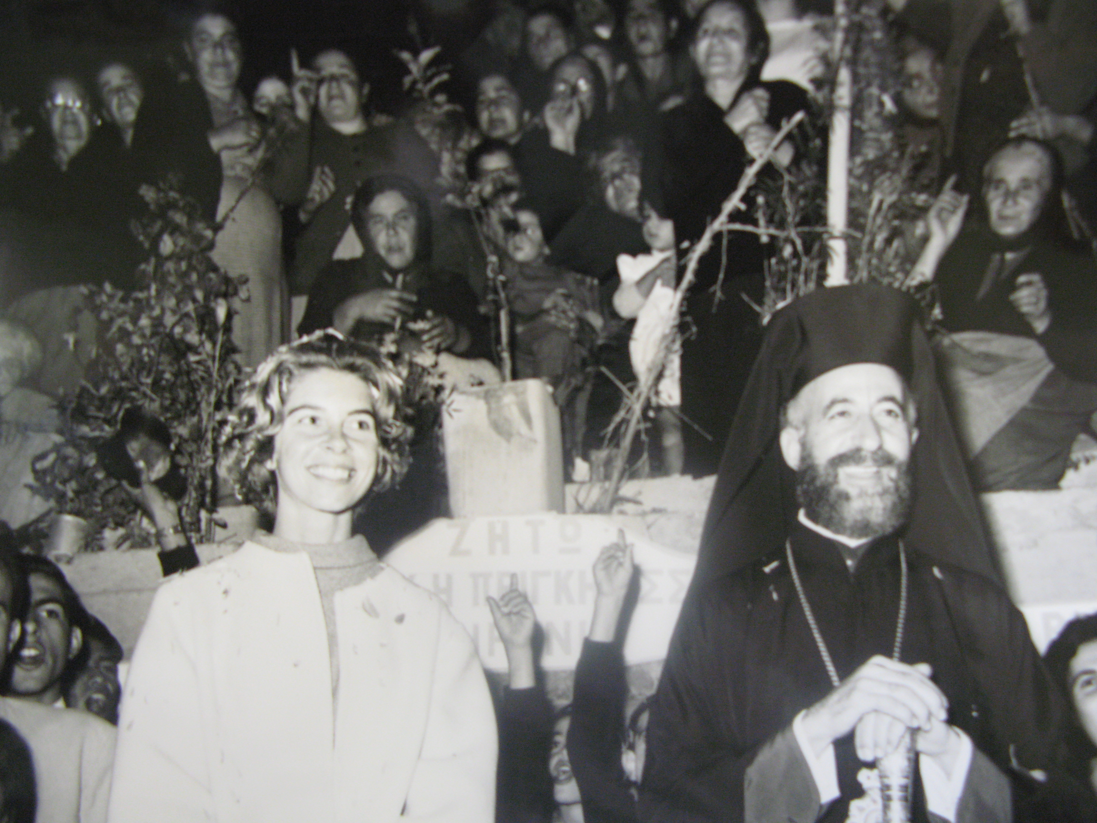 Η Ειρήνη και ο Αρχιεπίσκοπος Μακάριος πανευτυχείς σε επίσκεψή τους σε κάποιο κυπριακό χωριό (΄Φωτογραφία: Αρχείο Γραφείου Τύπου και Πληροφοριών)