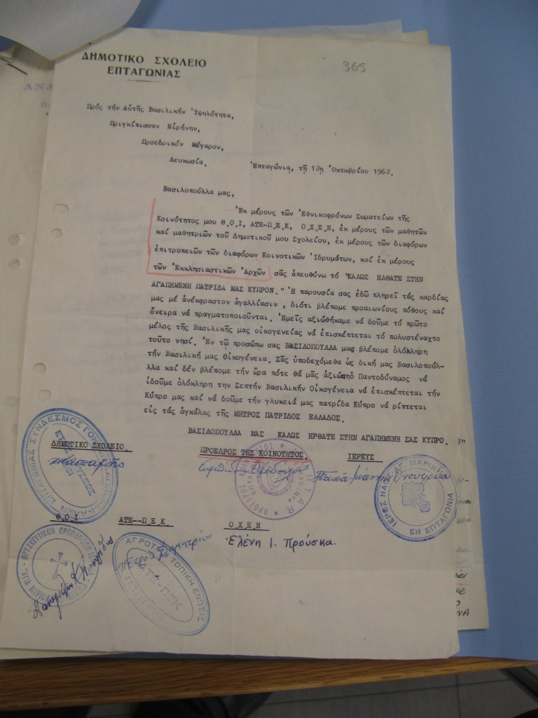 Εδώ και πολλά χρόνια έχω συγκεντρώσει από τα Γενικά Αρχεία του Κράτους, στην Αθήνα και το «Αρχείο Βασιλικών Ανακτόρων», δεκάδες έγγραφα και επιστολές προς την Ειρήνη από την Κύπρο, της περιόδου 1962-1963, σχετικά με την επίσκεψή της στην Κύπρο, προσβλέποντας σε μια μελλοντική δημοσίευση. Παρουσιάζω εδώ μια από αυτές, ως απολύτως ενδεικτική του κλίματος που επικράτησε. Προέρχεται από το χωριό Επταγώνια της επαρχίας Λεμεσού και την υπογράφουν ο κοινοτάρχης, ο ιερέας, ο διευθυντής του σχολείου και οι εκπρόσωποι των σωματείων του χωριού.