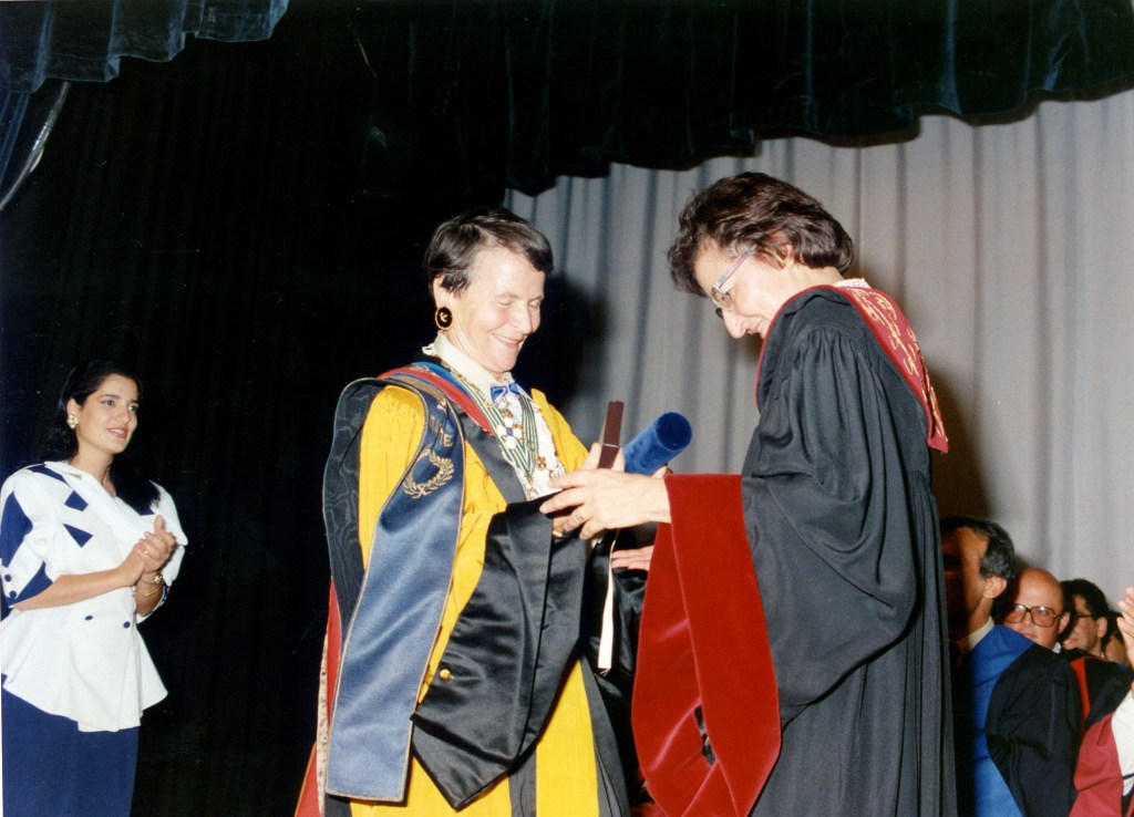 Η φωτογραφία (Αρχείο Πανεπιστημίου Κύπρου) από την τελετή εγκαινίων του Πανεπιστημίου Κύπρου, τπον Οκτώβριο του 1992. Η Ελένη Αρβελέρ με τη Νέλλη Τσουγιοπούλου