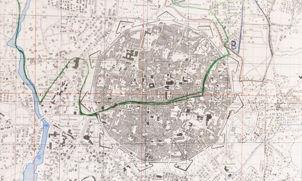 Ο χάρτης της Λευκωσίας με την Πράσινη Γραμμή της διαίρεσης από τις τελευταίες μέρες του 1963, όπως εκτίθεται στο Δημοτικό Λεβέντειο Μουσείο Λευκωσίας, στην έκθεση Sector 2: Λευκωσία
