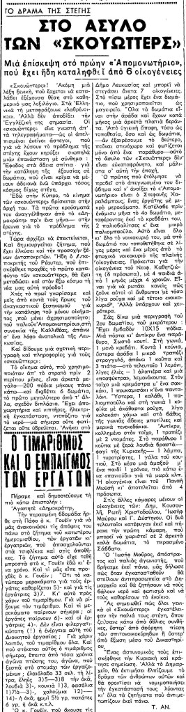 Ο «Δημοκράτης» επανήλθε στο θέμα του κτιρίου του πρώην Απομονωτηρίου με πρωτοσέλιδο δημοσίευμα στο φ. 19 Νοεμβρίου 1946, που υπογράφει ο Τ. ΑΝ., δηλαδή ο γνωστός ποιητής, δημοσιογράφος και στέλεχος του ΑΚΕΛ, Τεύκρος Ανθίας. Το παραθέτω ολόκληρο γιατί είναι αποκαλυπτικό και η περιγραφή εξαιρετικά αναλυτική. Σημειώνω ότι ακόμη δεν είχε βρεθεί η ελληνική λέξη για τους «σκουώττερς» – ο Ανθίας λέει ότι μεταφραζόταν «λαθρένοικοι» – κι ότι η περιοχή καταγράφεται ως «συνοικία της Καλλιθέας, απάνω σ’ ένα λόφο ανατολικά της Λευκωσίας».