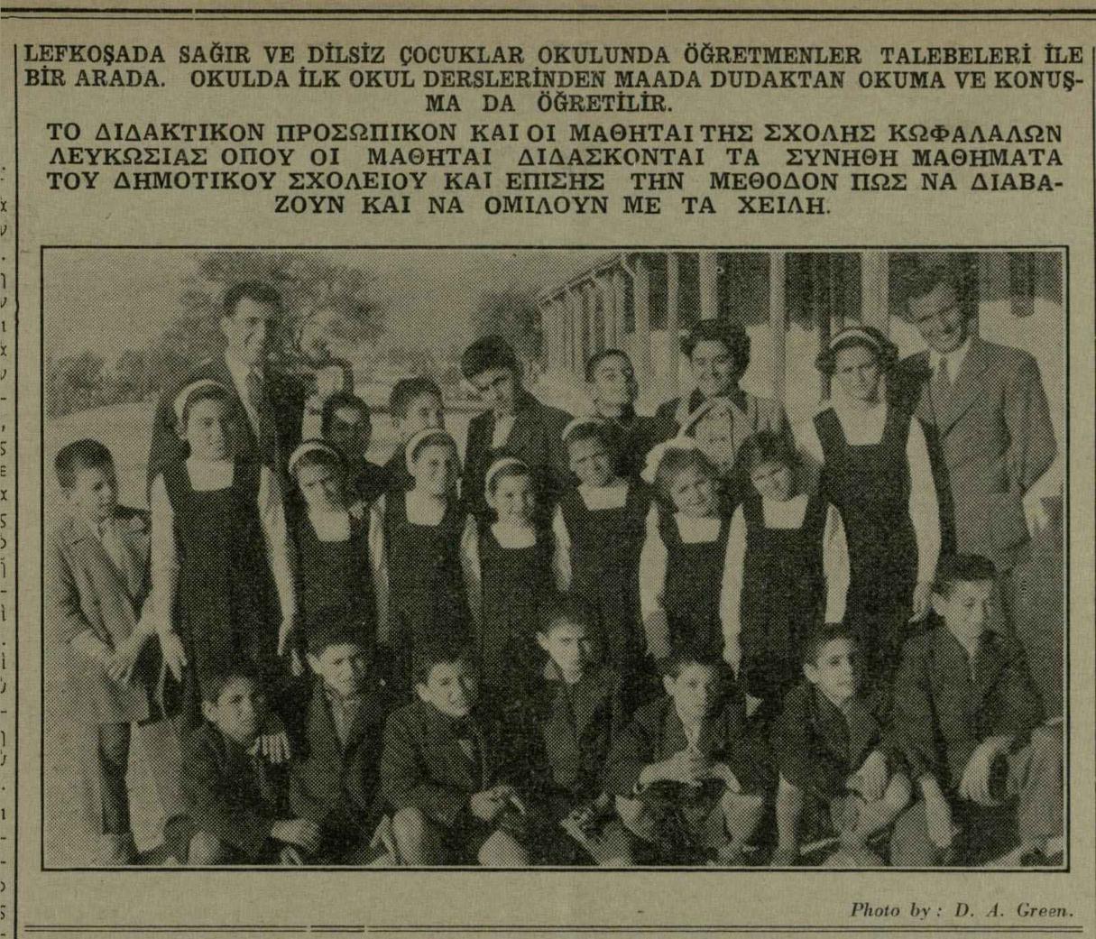 Φωτογραφία των πρώτων μαθητών και μαθητριών μπροστά από το κτίριο της Σχολής Κωφαλάλων στη δίγλωσση (ελληνικά και τουρκικά) εφημερίδα C.M.C. Welfare News, στο φ. 8 Αυγούστου 1954.