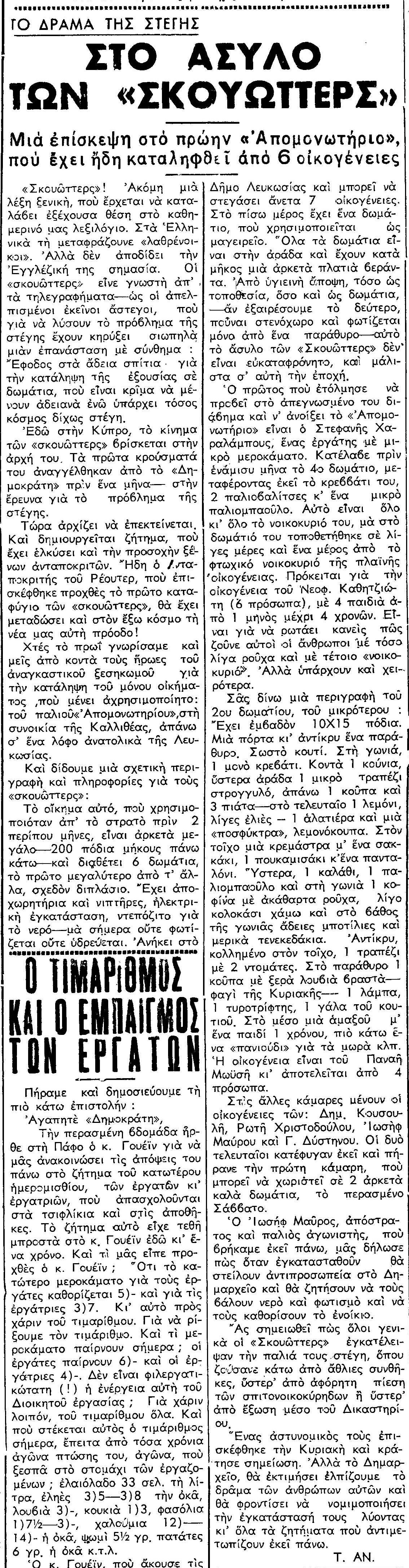 Ο «Δημοκράτης» επανήλθε στο θέμα του κτιρίου του πρώην Απομονωτηρίου με πρωτοσέλιδο δημοσίευμα στο φ. 19 Νοεμβρίου 1946, που υπογράφει ο Τ. ΑΝ., δηλαδή ο γνωστός ποιητής, δημοσιογράφος και στέλεχος του ΑΚΕΛ, Τεύκρος Ανθίας. Το παραθέτω ολόκληρο γιατί είναι αποκαλυπτικό και η περιγραφή εξαιρετικά αναλυτική. Σημειώνω ότι ακόμη δεν είχε βρεθεί η ελληνική λέξη για τους «σκουώττερς» – ο Ανθίας λέει ότι μεταφραζόταν «λαθρένοικοι» – κι ότι η περιοχή καταγράφεται ως «συνοικία της Καλλιθέας, απάνω σ’ ένα λόφο ανατολικά της Λευκωσίας».